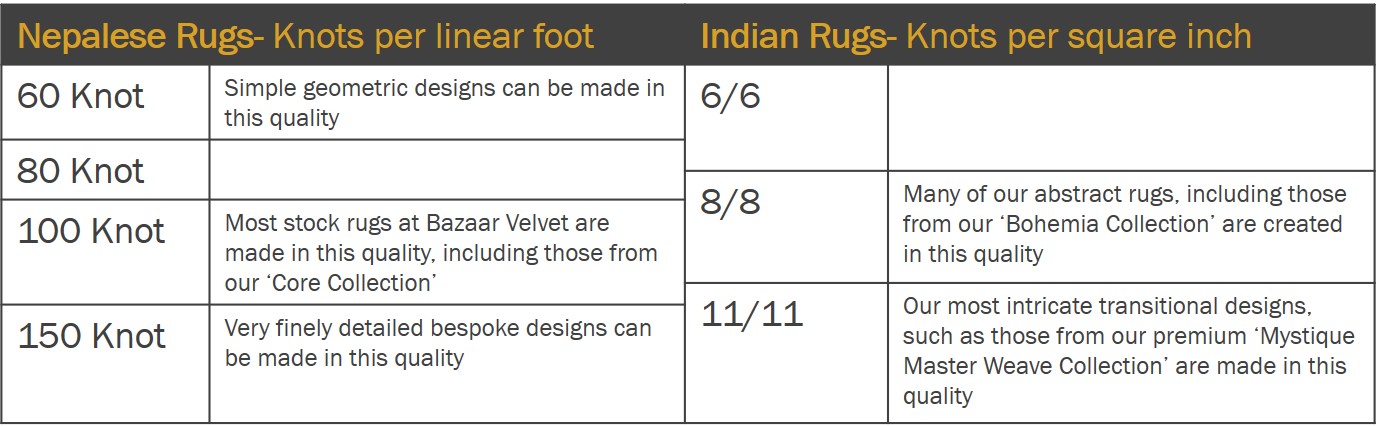 For example, in our popular ‘100 knot’ quality you will find 100 hand tied knots in a foot long row.