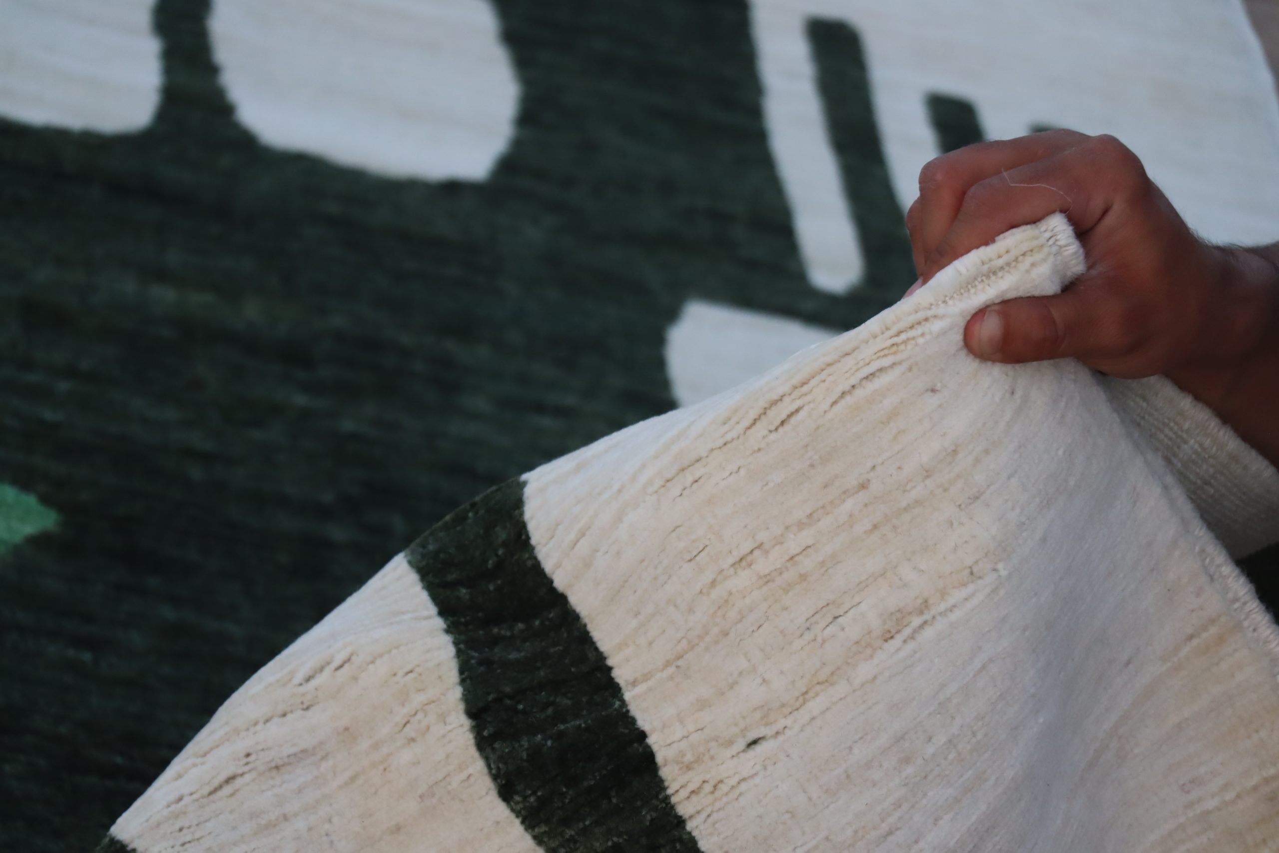 Bazarak Rug. Bazaar Velvet of London have created a new collection called “Afghan Moon” this is a partnership where they are committed to helping women weavers of Afghanistan re-enter the workplace. Traditional Afghan cultural practices, as well as more recent restrictions affecting women’s ability to travel, study and work, have meant that many women have taken up the art of carpet weaving in their homes. These women have taken on this ancient skill that helps with isolation and offers support to their families who desperately needed incomes at this time of economic crisis in Afghanistan. Afghan carpets have a long and rich history. The art of carpet making in Afghanistan is thought to date back to the 16th century, when the Afghan people began to use carpets as a form of decoration and to keep their homes warm during the cold winter months. These carpets are made with Ghazni wool possibly the best in the world from their mountain goats and hand spinning the wool gives a beautiful silky sheen and creates stunning quality rugs full of character and charm. No one colour is solid as the wool is twisted together before dying creating variation in each shade. Designs take on an organic form where nothing repeats or has any symmetry, inspiration comes from a nod to the Bauhaus movement in the early 1900’s however these designs are much less structured. Each piece is Step labelled a wonderful charity organization improving the wellbeing of weavers and workers and promoting Fair Trade Standards. For more information visit  https://label-step.org/countries/afghanistan/