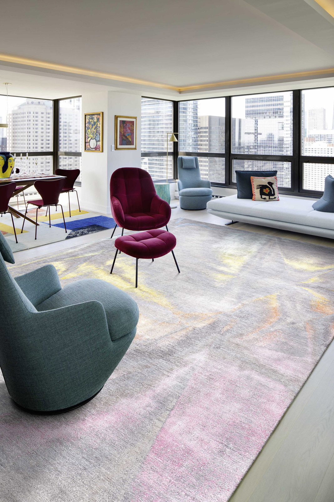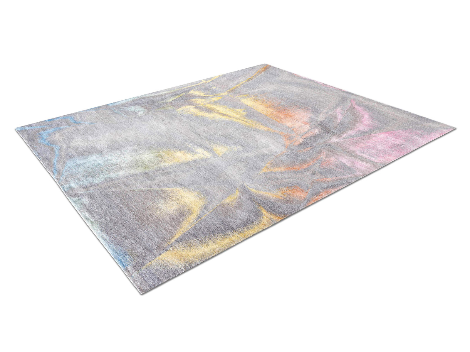 PastelSun is our unique innovative color graduation of all rainbow colors in the pattern on various light grey tones in the background. For starters here is a short explanation of this collection: we shot pictures of the sky in the streets outside of our RUG STAR office in Berlin-Mitte, I think this was in 2010. Went inside, printed them, folded the paper sheets, scanned the results, and started the digital design process from there. We looked for the expected and emotional shifts in texture by layering analog and digital processing in our design work. Always leave space for a miracle, a good friend of mine used to say and we use this as an ingredient since then. .The collection has three main designs and countless variations in color, material, and technique executions. Started as a Tibetan collection, most of the latest developments are produced in Persian weave in our workshop in Jaipur, Rajasthan