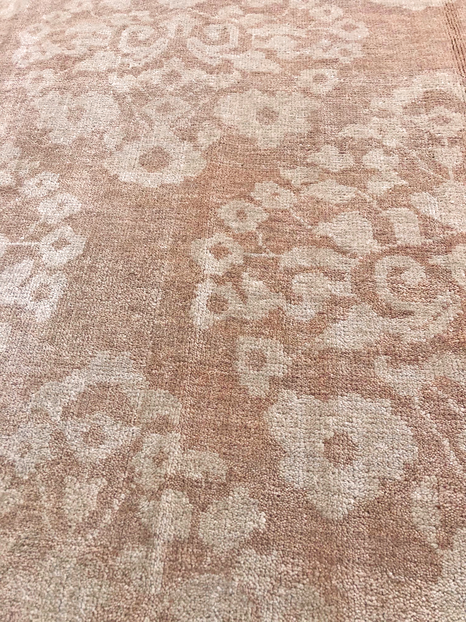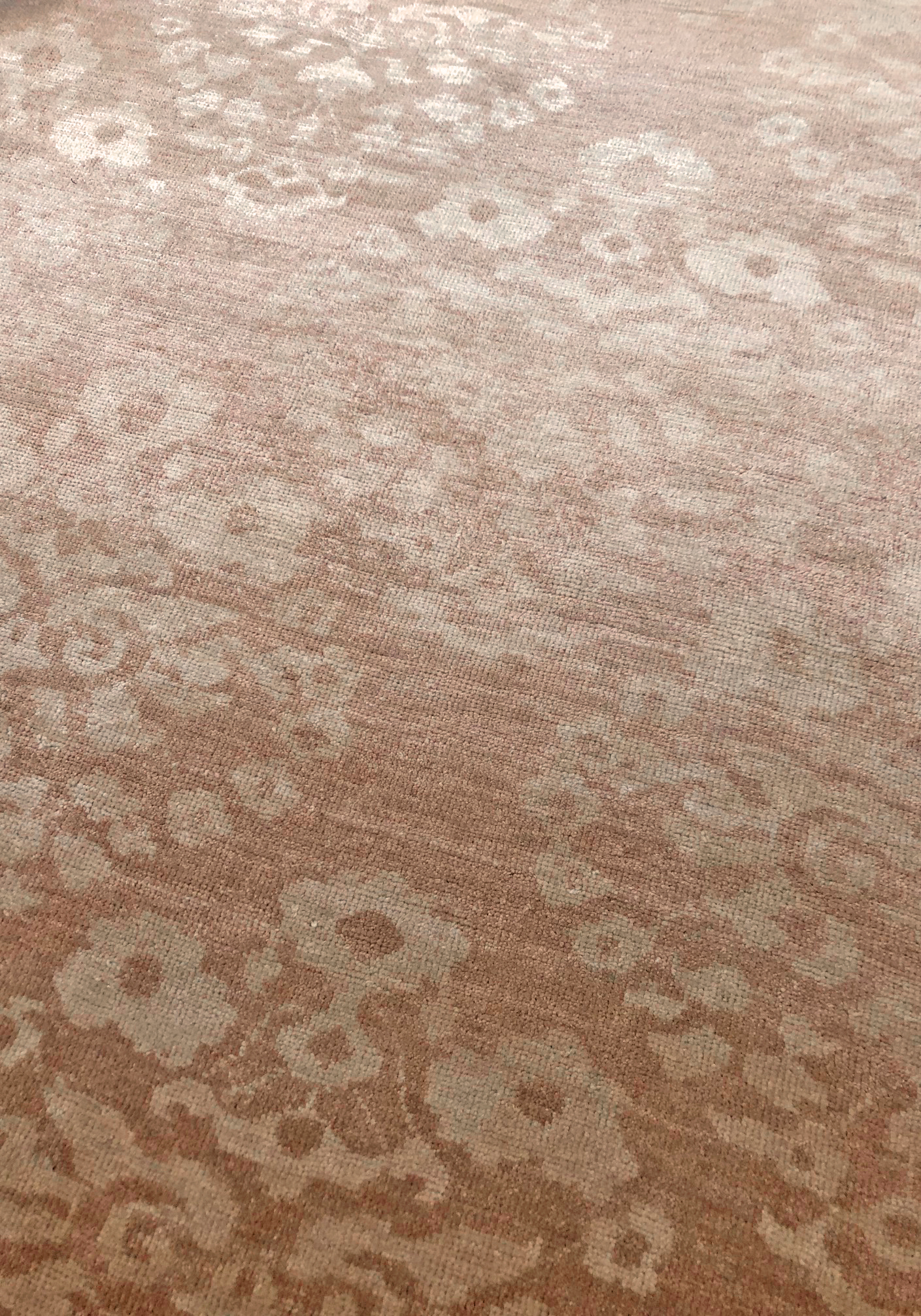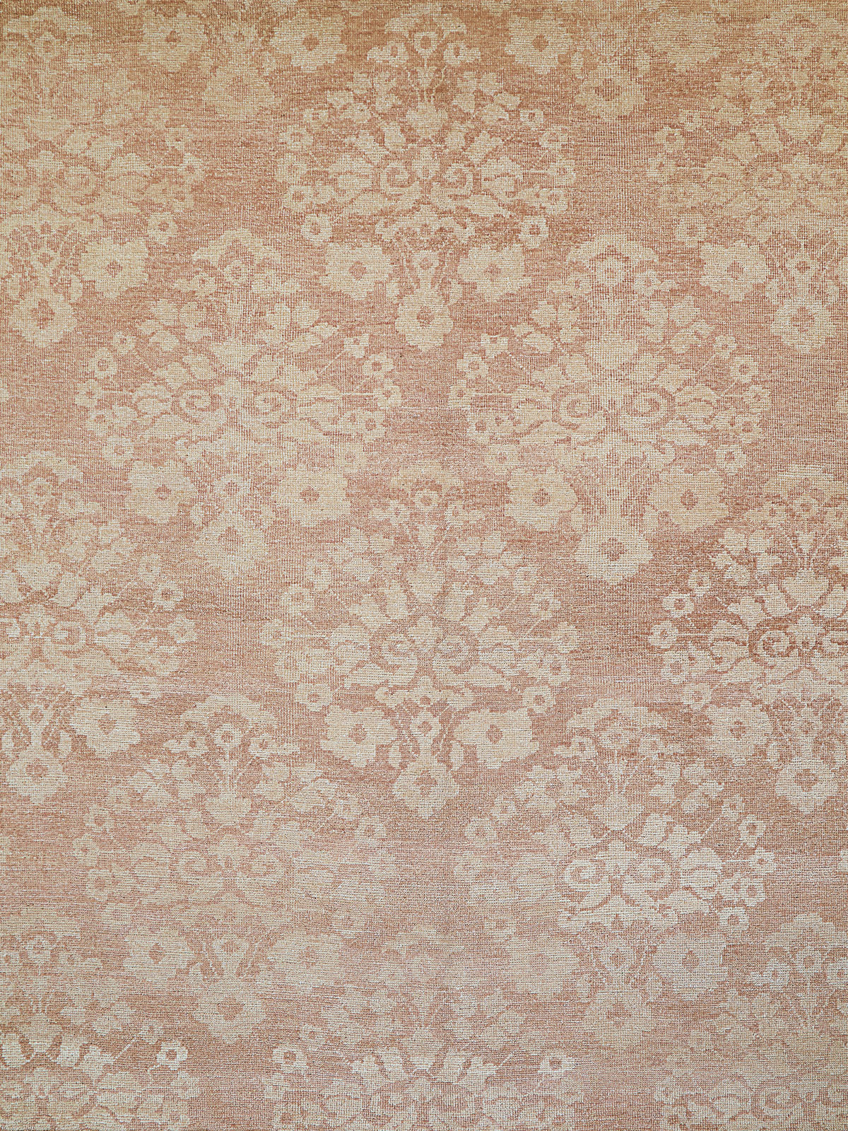 Highclere Rug – Peach Beige. This contemporary classic is influenced by traditional Ottoman design. Stylized flowers are timelessly elegant, and this faded pink colour gives the rug a gorgeous antique appearance. Hand Knotted from Hand-Dyed wool, this rug has beautiful colour variation and is full of character.