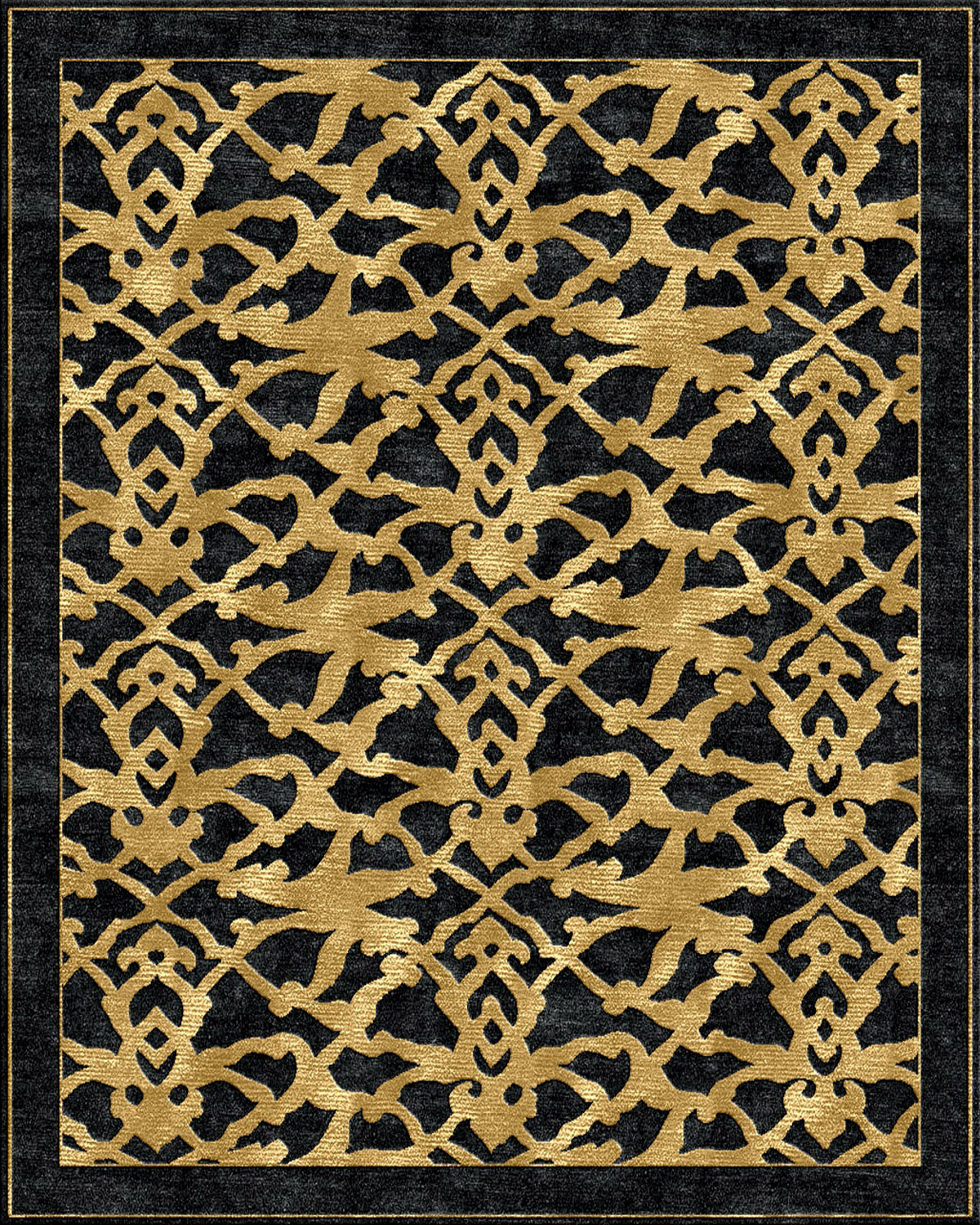 Arabesque Rug – Gold. A stunning contemporary design inspired by the classic oriental carpet, featuring luxurious raised silk pile contrasted with Himalayan wool. Every piece is created by a team of skilled artisans who complete every stage of the process using traditional methods. From the preparation of the wool and silk, to constructing the rug knot by knot, this craftsmanship delivers a rug that will last generations.
