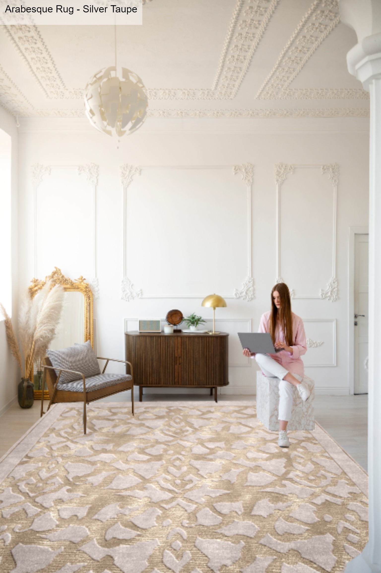 Arabesque Rug – Silver Taupe. A stunning contemporary design inspired by the classic oriental carpet, featuring luxurious raised silk pile contrasted with Himalayan wool. Every piece is created by a team of skilled artisans who complete every stage of the process using traditional methods. From the preparation of the wool and silk, to constructing the rug knot by knot, this craftsmanship delivers a rug that will last generations.