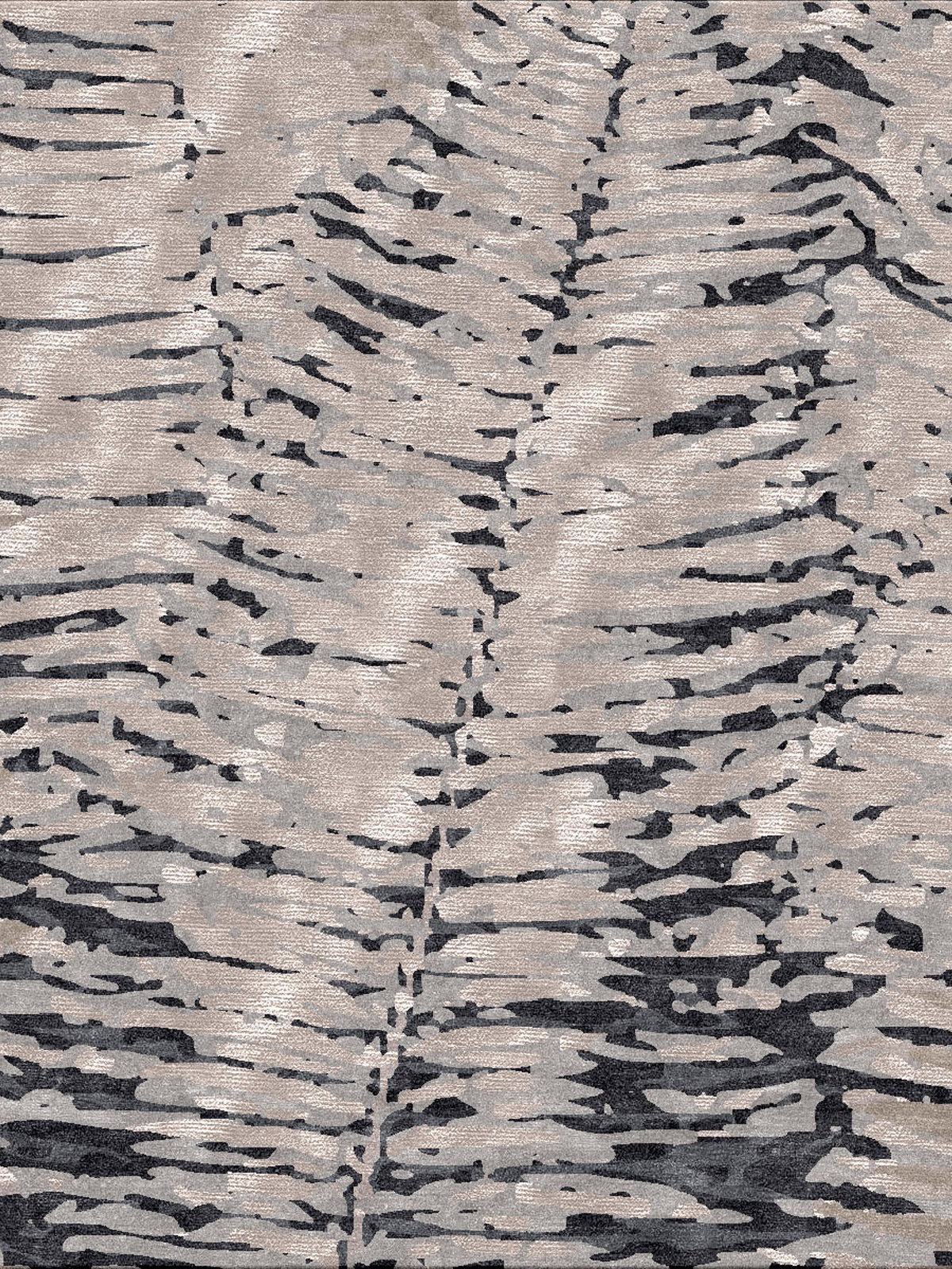 Fern Rug – Silver. Inspired by nature, this fern leaf design is a forest of calming curves. Every piece is created by a team of skilled artisans who complete every stage of the process using traditional methods. From the preparation of the wool and silk, to constructing the rug knot by knot, this craftsmanship delivers a rug that will last generations.