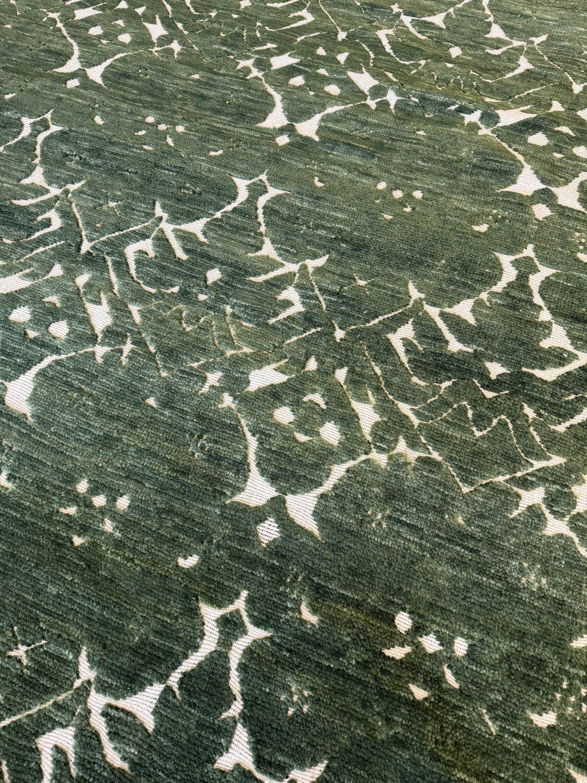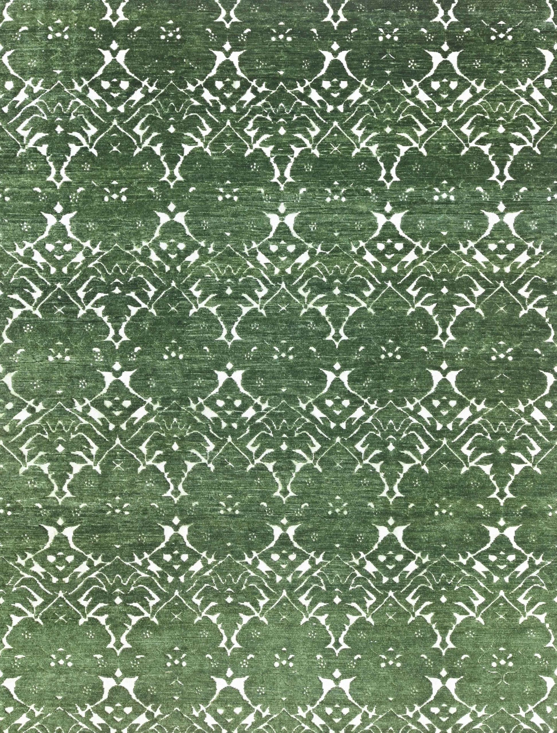 Floral Lace Rug – Emerald. This stunning luxury rug exudes timeless elegance with its sophisticated damask pattern, featuring a deep, muted green that gives any space a sense of refinement. The repeating motif of stylized floral and leaf shapes is thoughtfully arranged in a symmetrical pattern. With its understated luxury and harmonious symmetry, this rug is the perfect addition for those seeking an atmosphere of calm and refined style. Wonderful textures are created by blending of colours using different types of wool and high & low pile heights to give depth and character to each piece. This rug can be made in any size, shape, colour or design. Premium Hand Knotted Quality – £340 per square meter (16-18 week lead time).