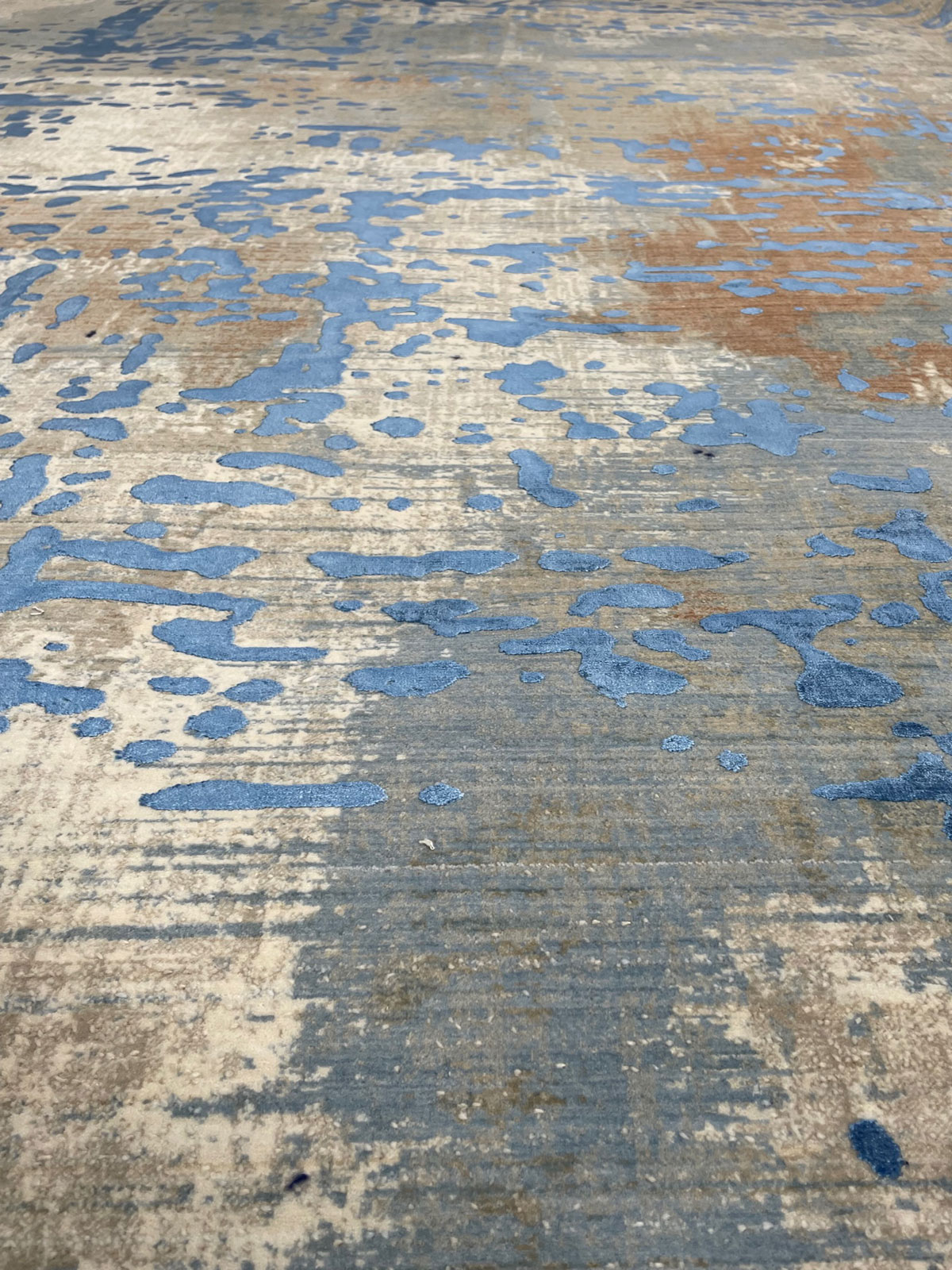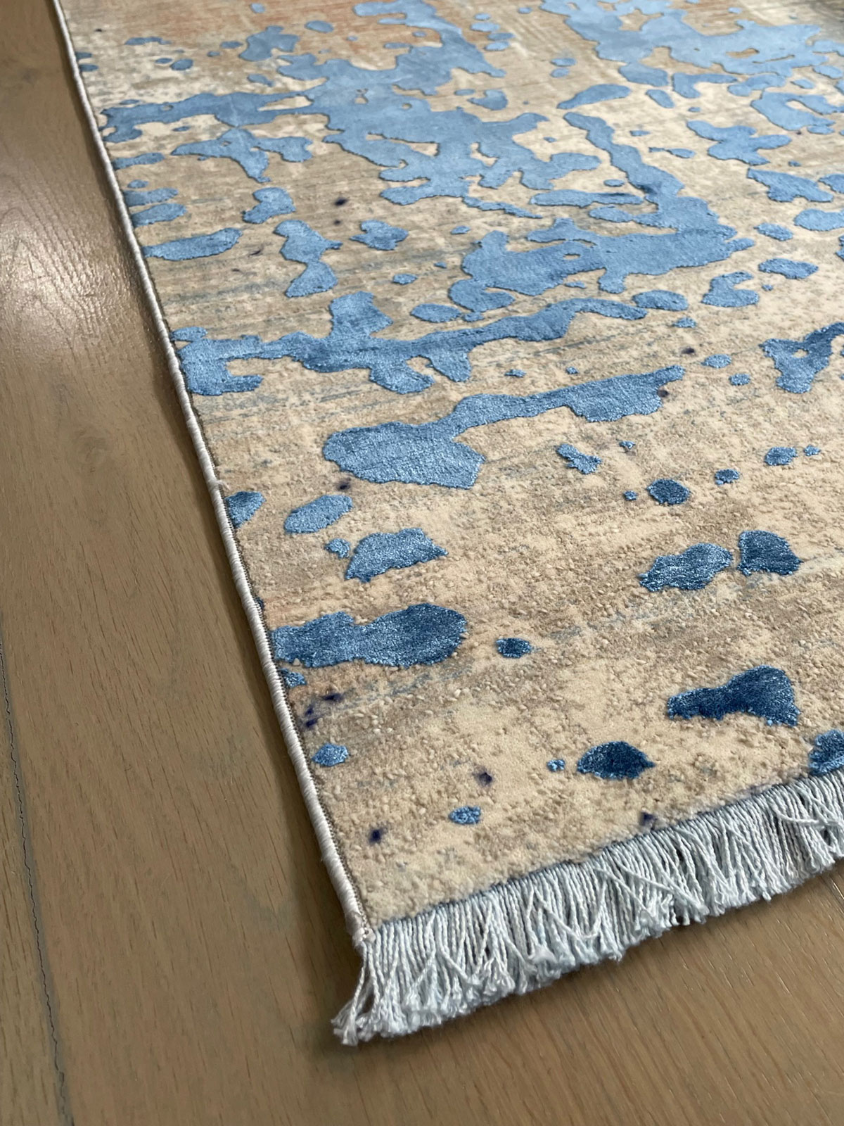 Green Park Rug – Neon Blue This stunning modern rug combines hints of electric blue with neutral tones to form a tranquil abstract design. It is created in Turkey on a power loom, using threads of polyester and art silk. These materials give the high and low pile texture a lustrous shimmer, perfect for a bedroom or living room rug. This collection has the finest knot count and intricate detailing of any power loomed rugs. They truly are heaven underfoot.