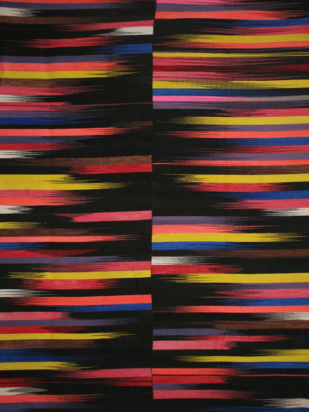 Gum Gum Flatweave Rug – Multi. This bold geometric rug is sure to make a statement in any living space. Bright multi-coloured stripes contrast with a deep black base for a playful bold design. Each of our flatweave rugs, or ‘kelims’ are created entirely by traditional methods. A team of skilled artisans prepare and dye the wool by hand, then construct the rug from hand tied knots, giving every piece a characterful woven texture. These rugs are cool and casual and are a perfect way to express your personal style in your room.