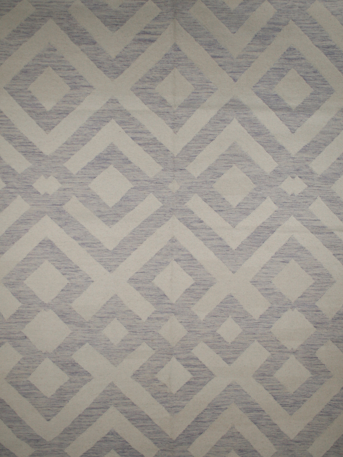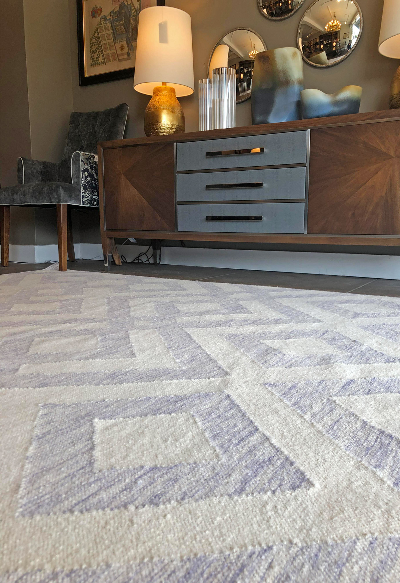 Kayseri Rug – Lavender. This large scale geometric design features a lovely soft purple colour on a crisp cream backdrop. Each of our flatweave rugs, or ‘kelims’, are created entirely by traditional methods. A team of skilled artisans prepare and dye the wool by hand, then construct the rug from hand tied knots, giving every piece a characterful woven texture and varied colour tone. These rugs are cool and casual and are a perfect way to express your personal style in any room of the home.