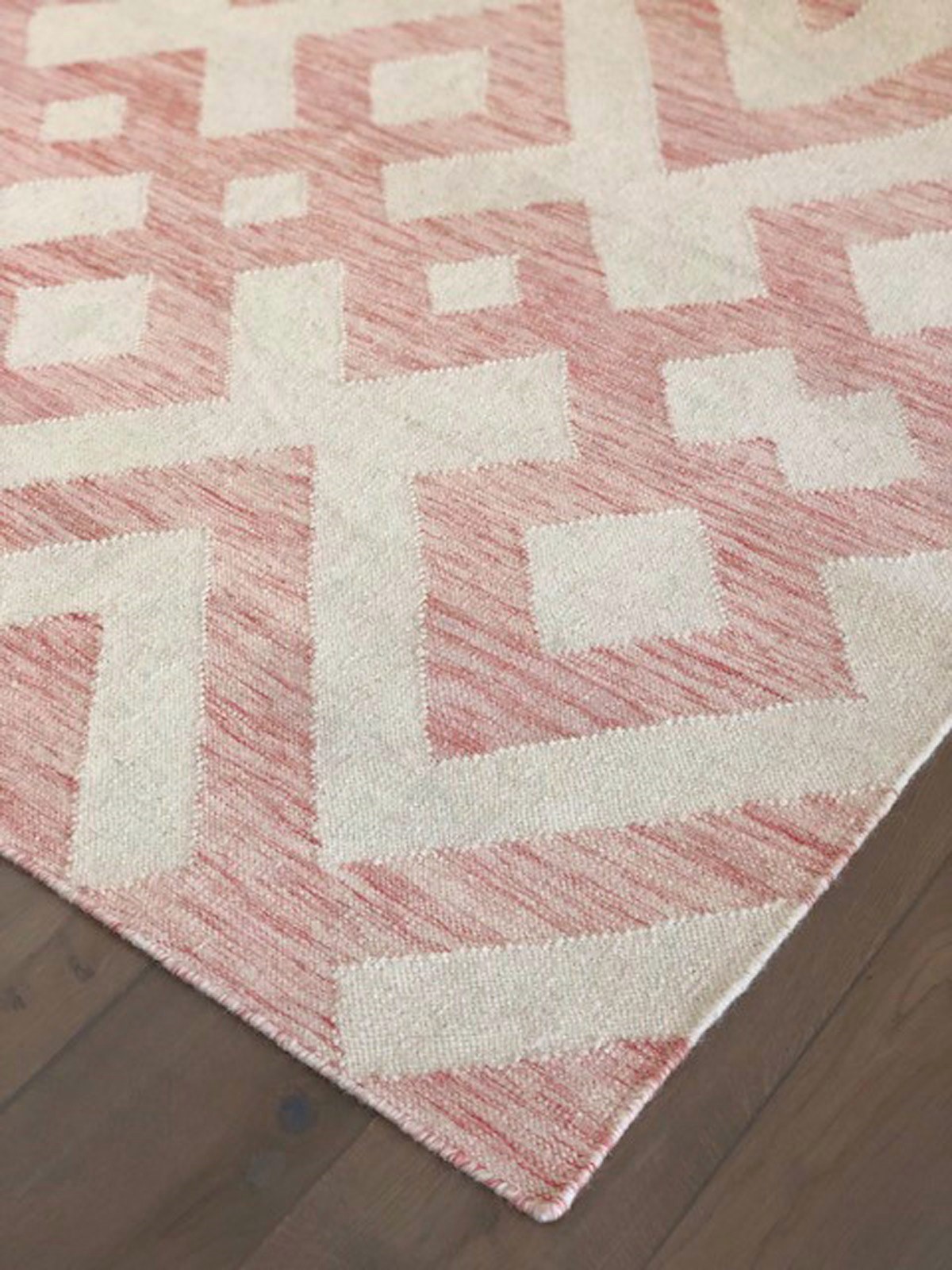 Kayseri Rug – Rose. A bold large scale geometric design with subtle pink tones, this is a great modern rug. Each of our flatweave rugs, or ‘kelims’, are created entirely by traditional methods. A team of skilled artisans prepare and dye the wool by hand, then construct the rug from hand tied knots, giving every piece a characterful woven texture and varied colour tone. These rugs are cool and casual and are a perfect way to express your personal style in any room of the home.