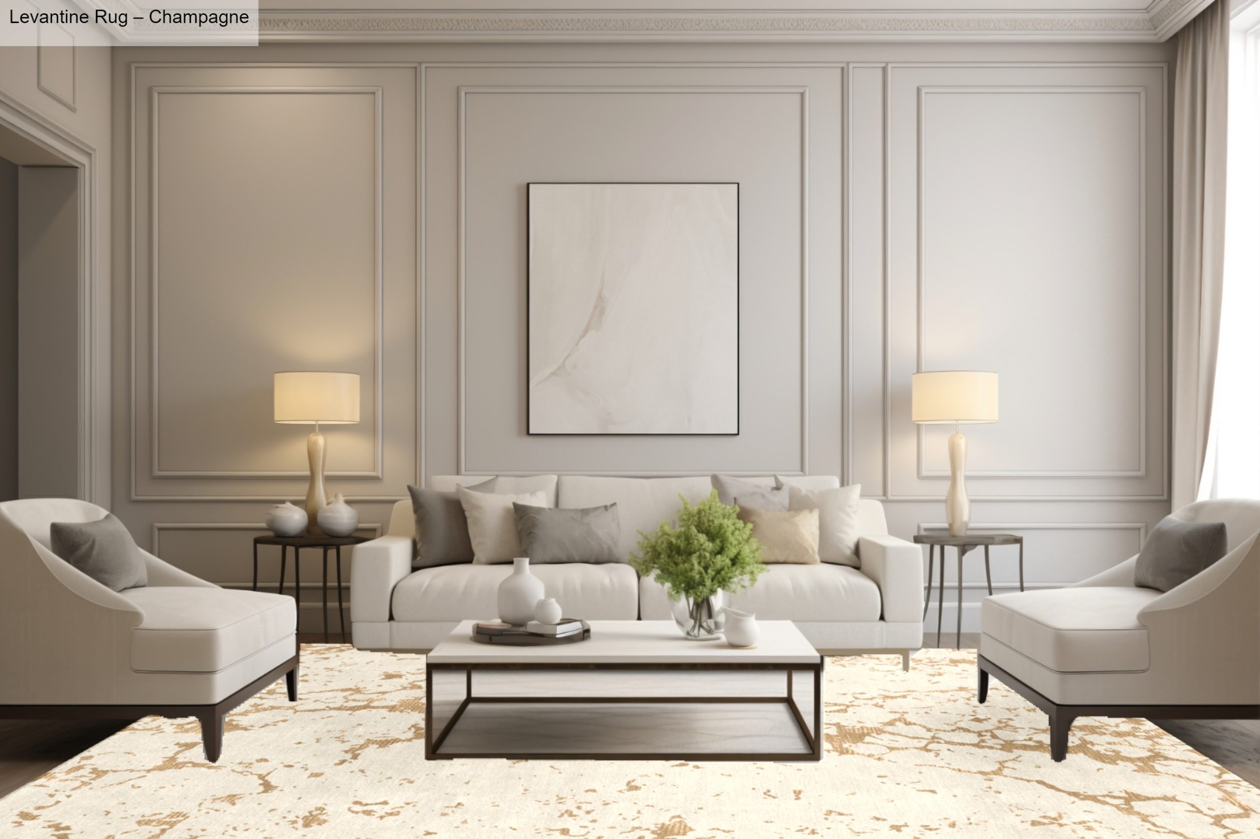 Levantine Rug – Champagne A marble-like vein of champagne silk runs through this exquisite contemporary rug. One of our most highly acclaimed designs, this rug represents extravagance, luxury and timeless style. Every piece is created by a team of skilled artisans who complete every stage of the process using traditional methods. From the preparation of the wool and silk, to constructing the rug knot by knot, this craftsmanship delivers a rug that will last generations.