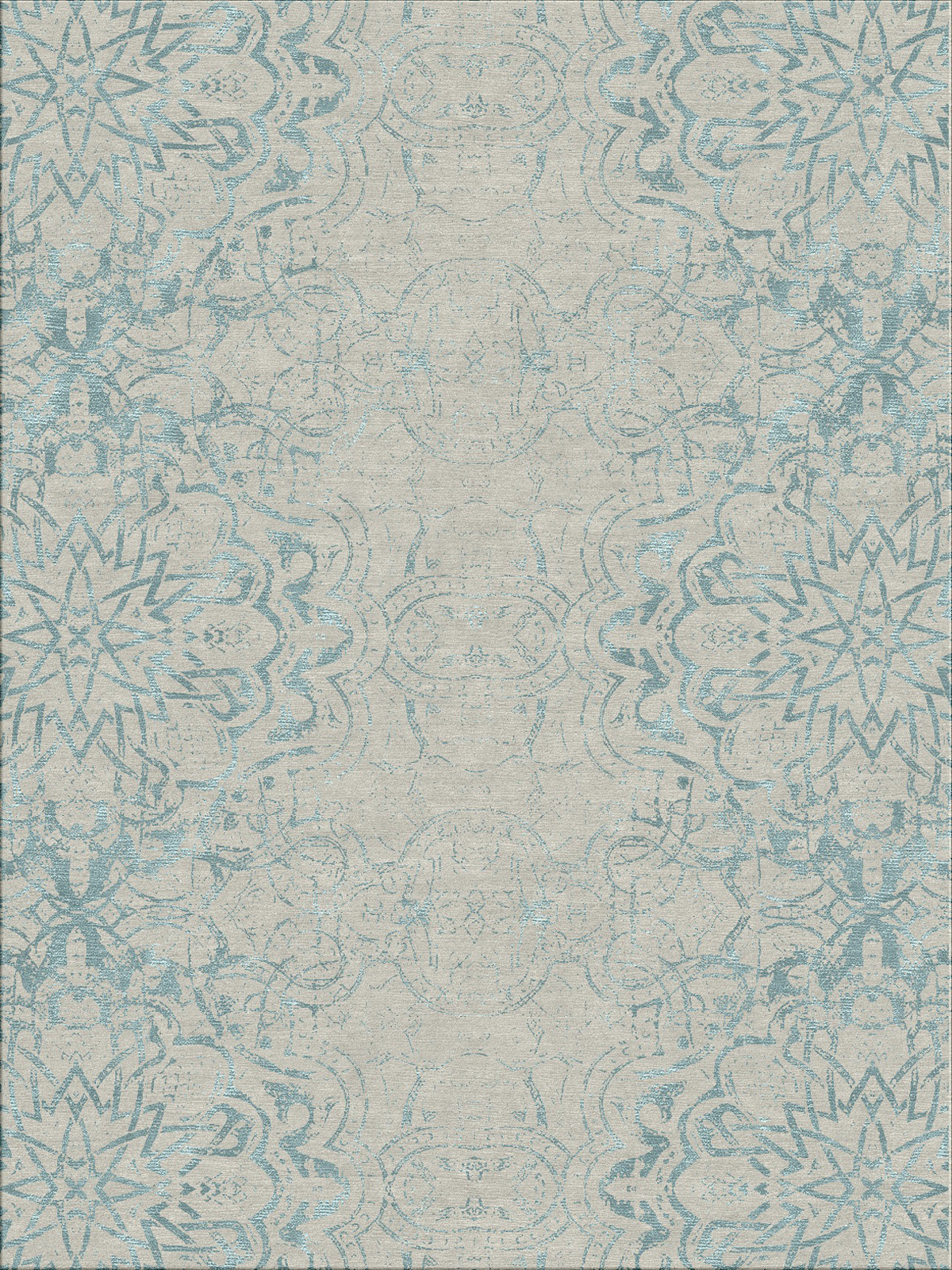 Madrasa Rug – Grey Blue. Inspired by Islamic Art, this modern interpretation of traditional Arabesque design uses layers of broken motifs to create a sense of antiquity. Every piece is created by a team of skilled artisans who complete every stage of the process using traditional methods. From the preparation of the wool and silk, to constructing the rug knot by knot, this craftsmanship delivers a rug that will last generations.