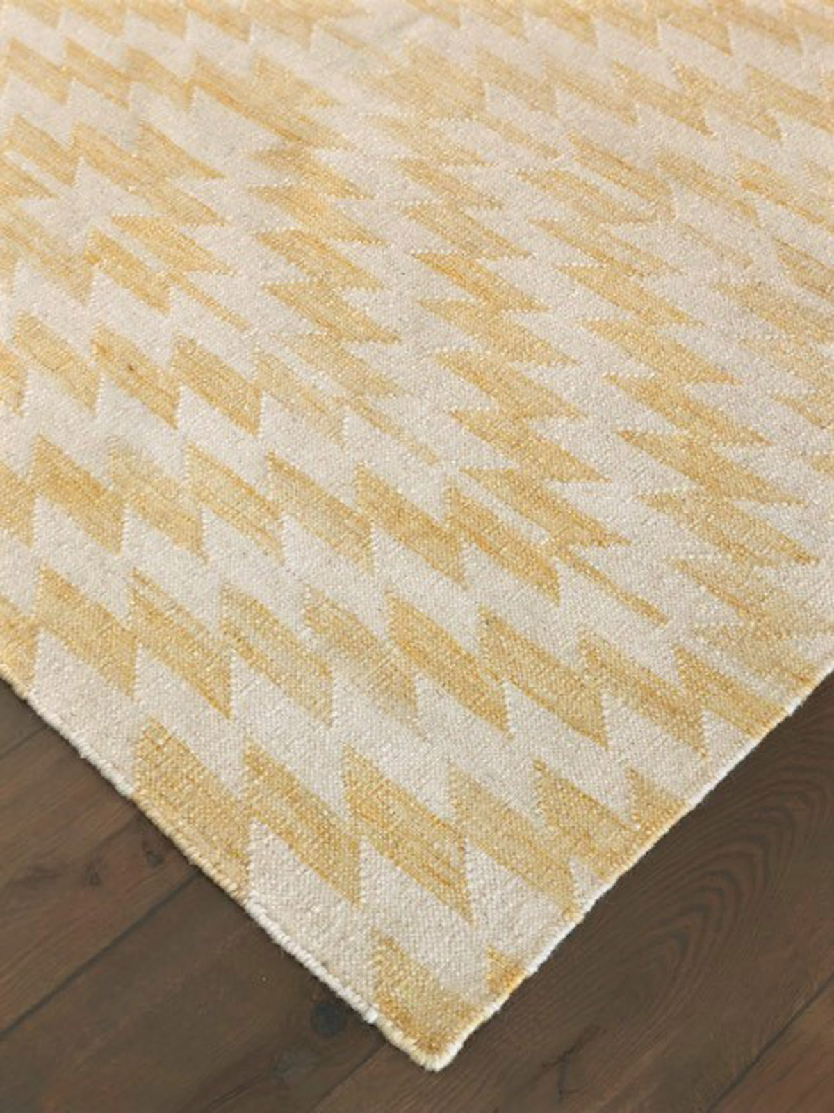 Malayta Rug – Citrus. An intricate diamond design is the basis for this lovely yellow geometric rug. Each of our flatweave rugs, or sometimes referred as ‘kelims’, are created entirely by traditional methods. A team of skilled artisans prepare and dye the wool by hand, then construct the rug from hand tied knots, giving every piece a characterful woven texture and varied colour tone. These rugs are cool and casual and are a perfect way to express your personal style in any room of the home.