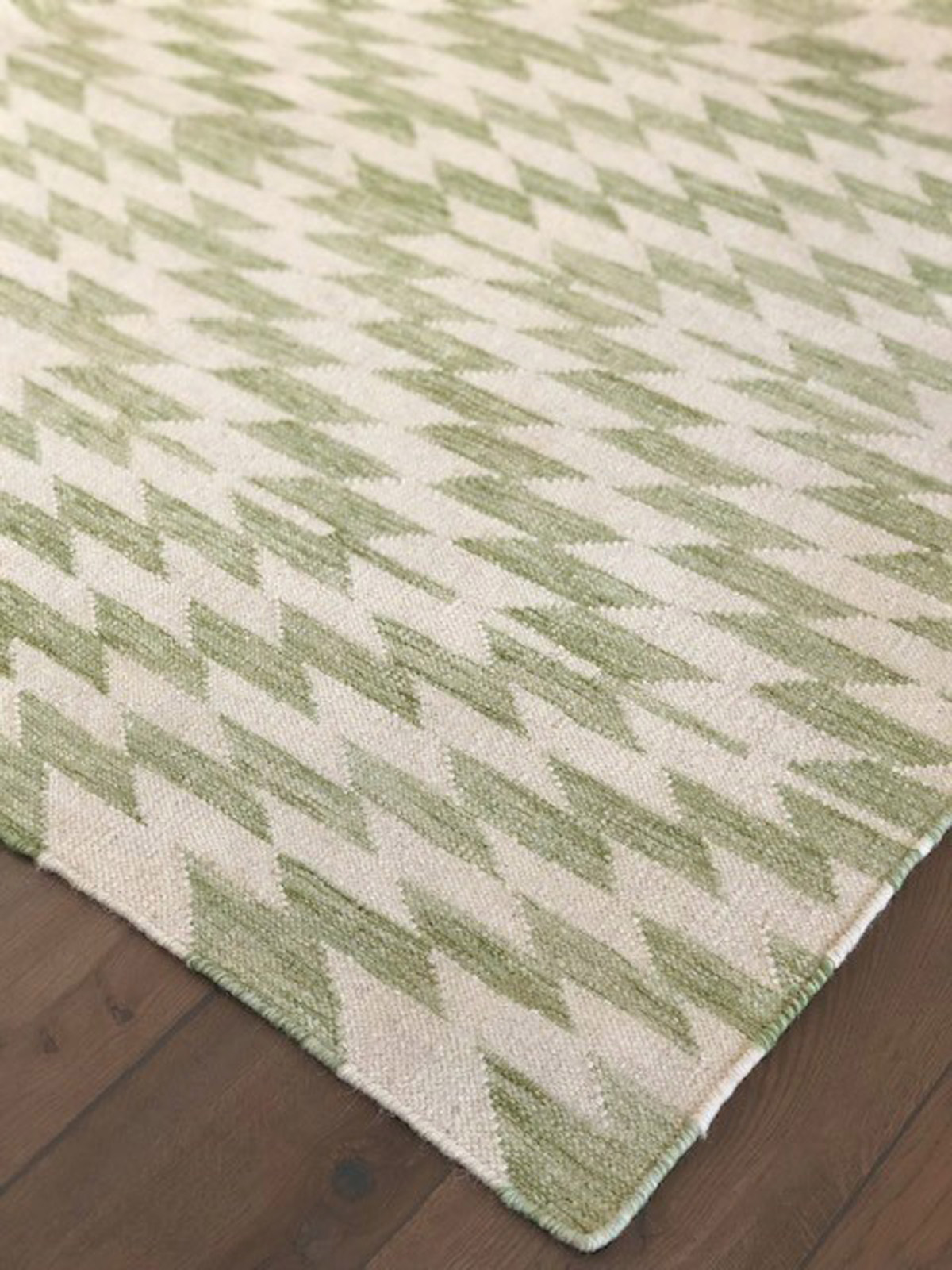 Malayta Rug – Mint. An intricate diamond design is the basis for this lovely green geometric rug. Each of our flatweave rugs, or ‘kelims’, are created entirely by traditional methods. A team of skilled artisans prepare and dye the wool by hand, then construct the rug from hand tied knots, giving every piece a characterful woven texture and varied colour tone. These rugs are cool and casual and are a perfect way to express your personal style in any room of the home.
