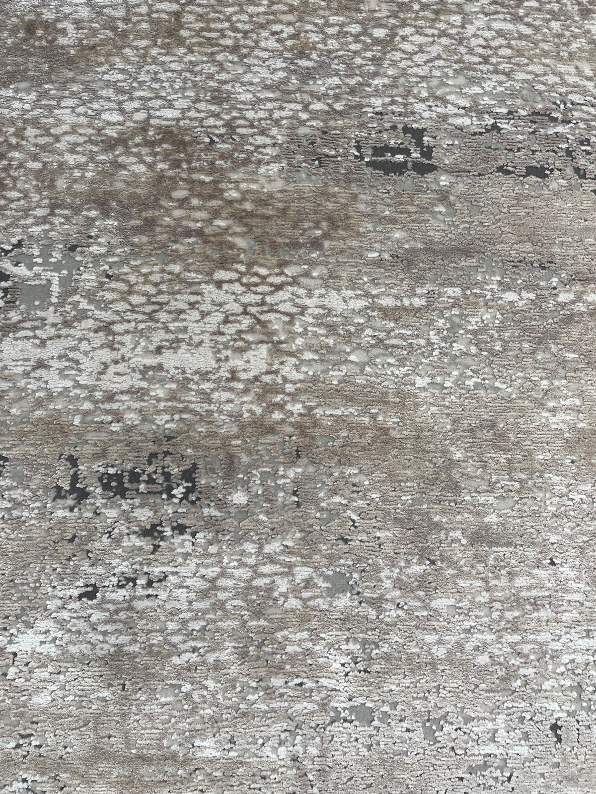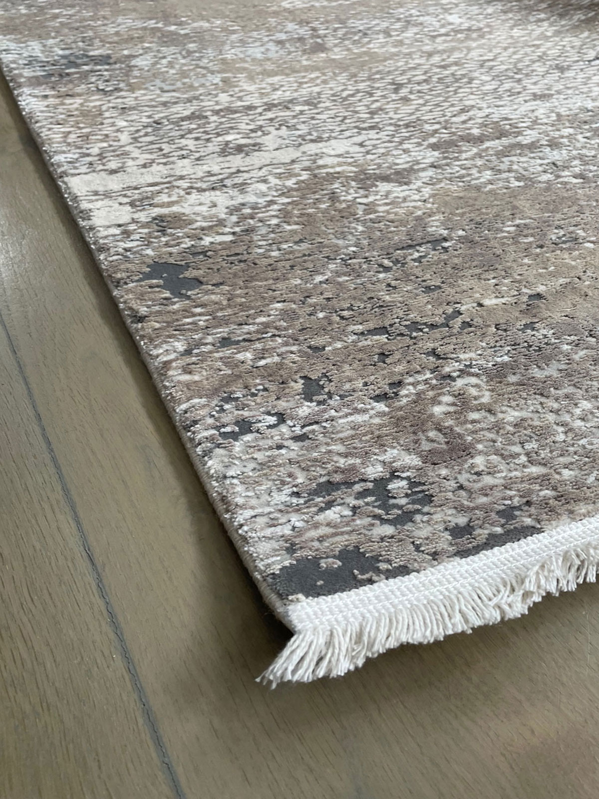 Notting Hill Gate Rug This stunning modern rug combines neutral tones to form a tranquil abstract design. It is created in Turkey on a power loom, using threads of polyester and art silk. These materials give the high and low pile texture a lustrous shimmer, perfect for a bedroom or living room rug. This collection has the finest knot count and intricate detailing of any power loomed rugs. They truly are heaven underfoot.