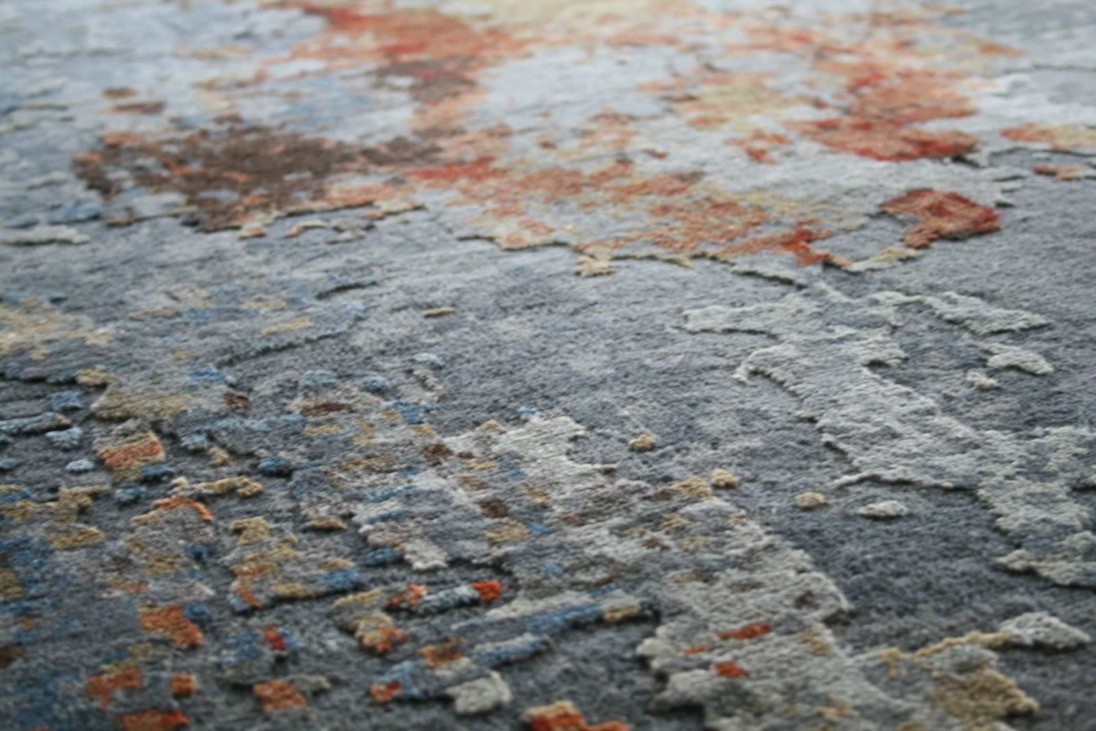 Pacha Mars Rug. This incredible intergalactic inspired rug combines fiery reds and oranges for a design that is out of this world. Created by the skilled weavers of Rajasthan, this incredible abstract rug features multi-ply silk of varying colour shades, cut to high and low pile heights.