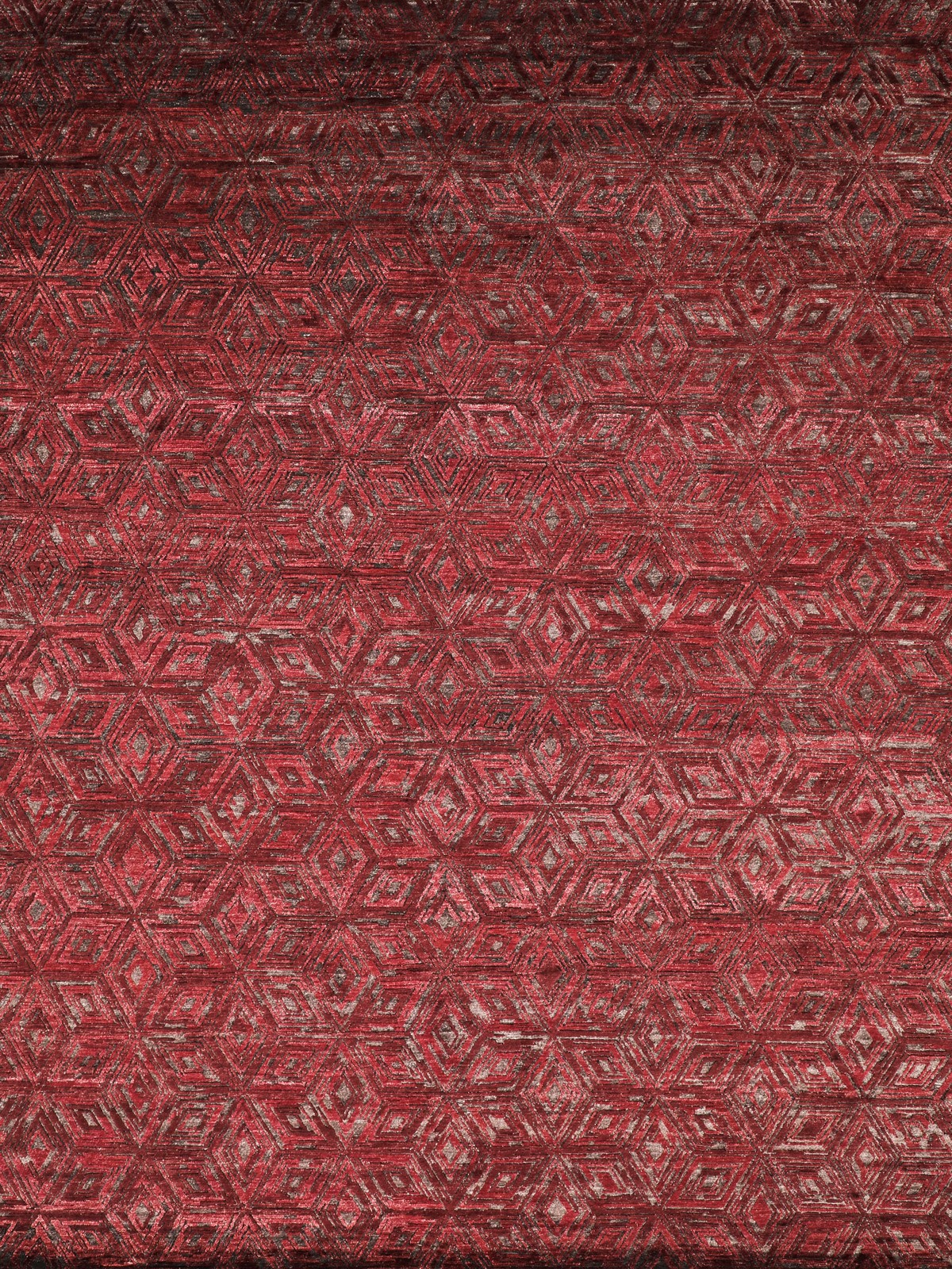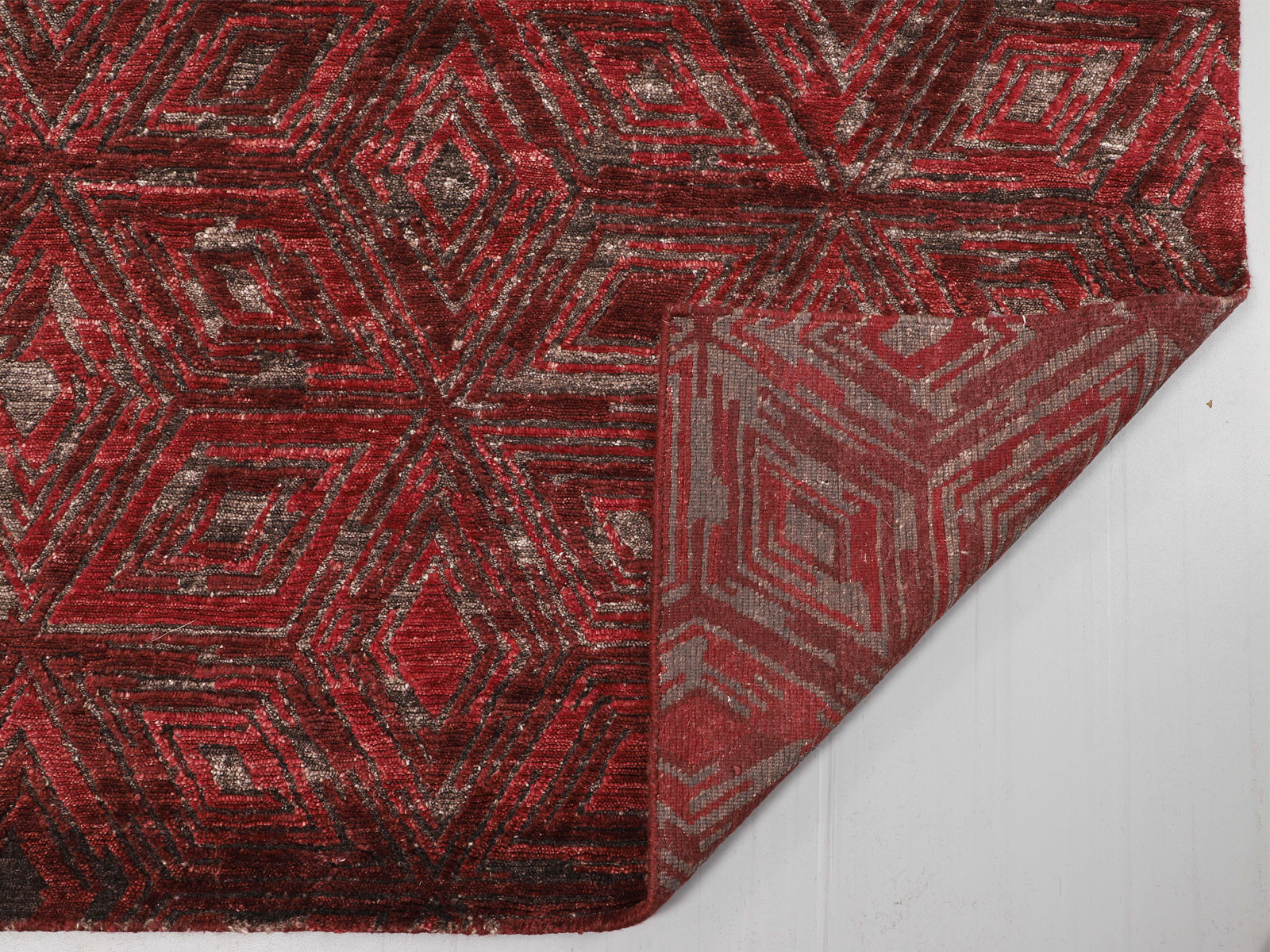Pacha Snowflake Rug. This sophisticated geometric rug design uses classic snowflake shapes to create a tiled effect that is luxurious and elegant. It is created using rich tones of burgundy coloured silk which is hand carved to create a wonderful texture.