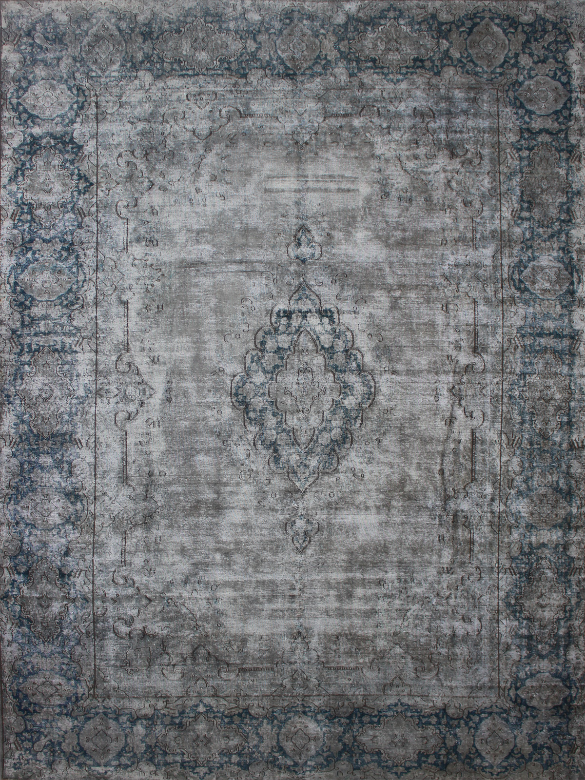 Persia Reloaded Rug – 2620. A unique one-off vintage rug, this faded beauty is created from a genuine vintage Persian, intentionally distressed to accentuate its antique appearance. Original bright colours are washed out and overdyed in a blue grey colour palette that is more accommodating to todays interiors, a look that blends seamlessly with both traditional and contemporary styles. Full of character and history, this is a classic Persian carpet reborn.
