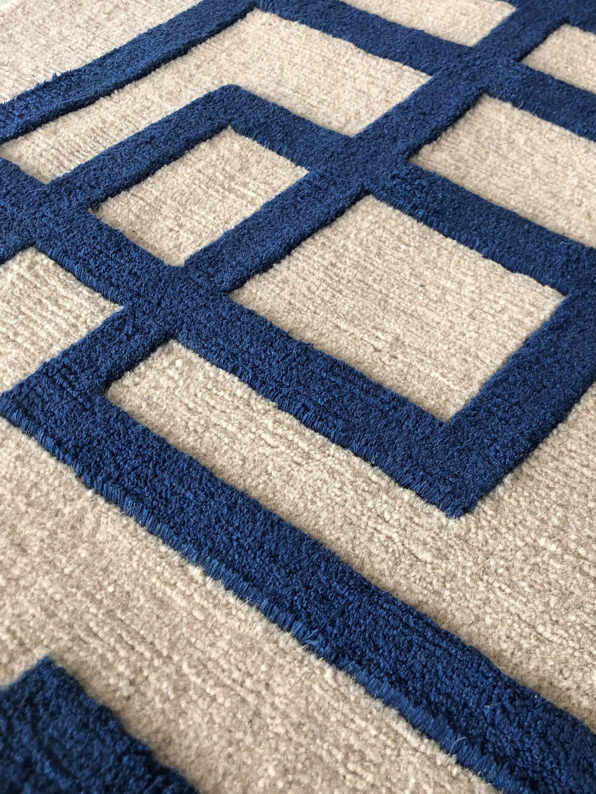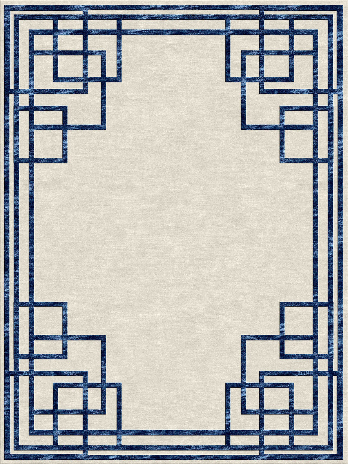 Rockefeller Rug – Ivory Blue. Our stunning ‘Rockefeller’ rug takes inspiration from the lavish opulence of the Art Deco movement. It’s strong geometric shapes are reminiscent of the period, styled in an elegant blue border design. A timeless contemporary rug. Every piece is created by a team of skilled artisans who complete every stage of the process using traditional methods. From the preparation of the wool and silk, to constructing the rug knot by knot, this craftsmanship delivers a rug that will last generations.