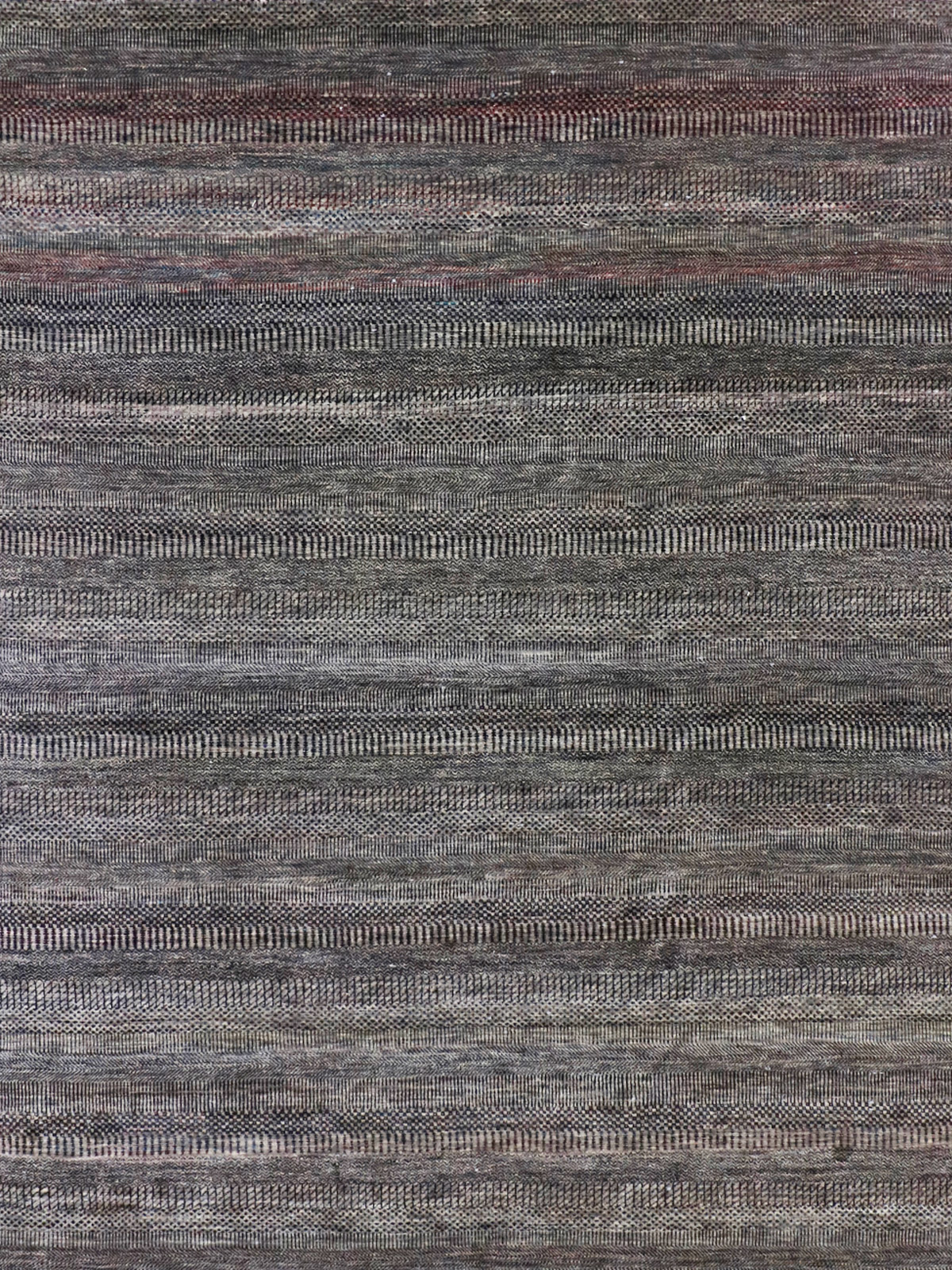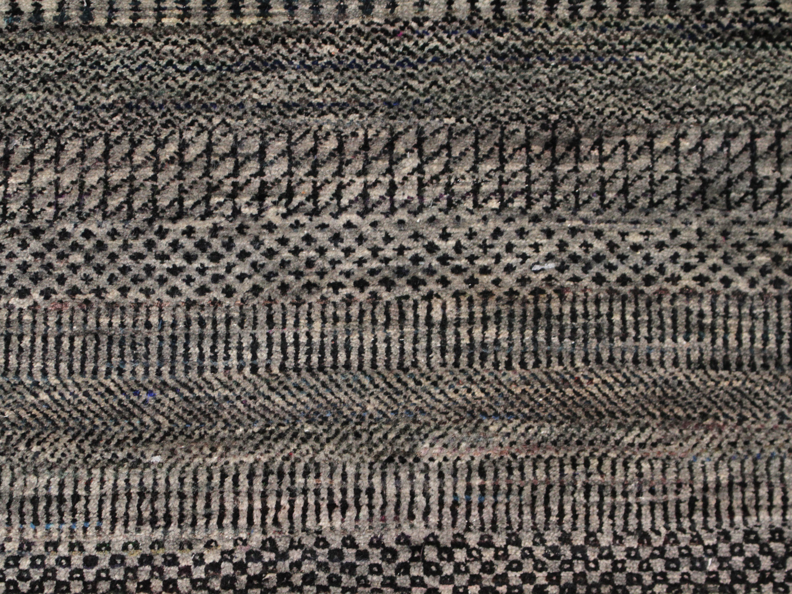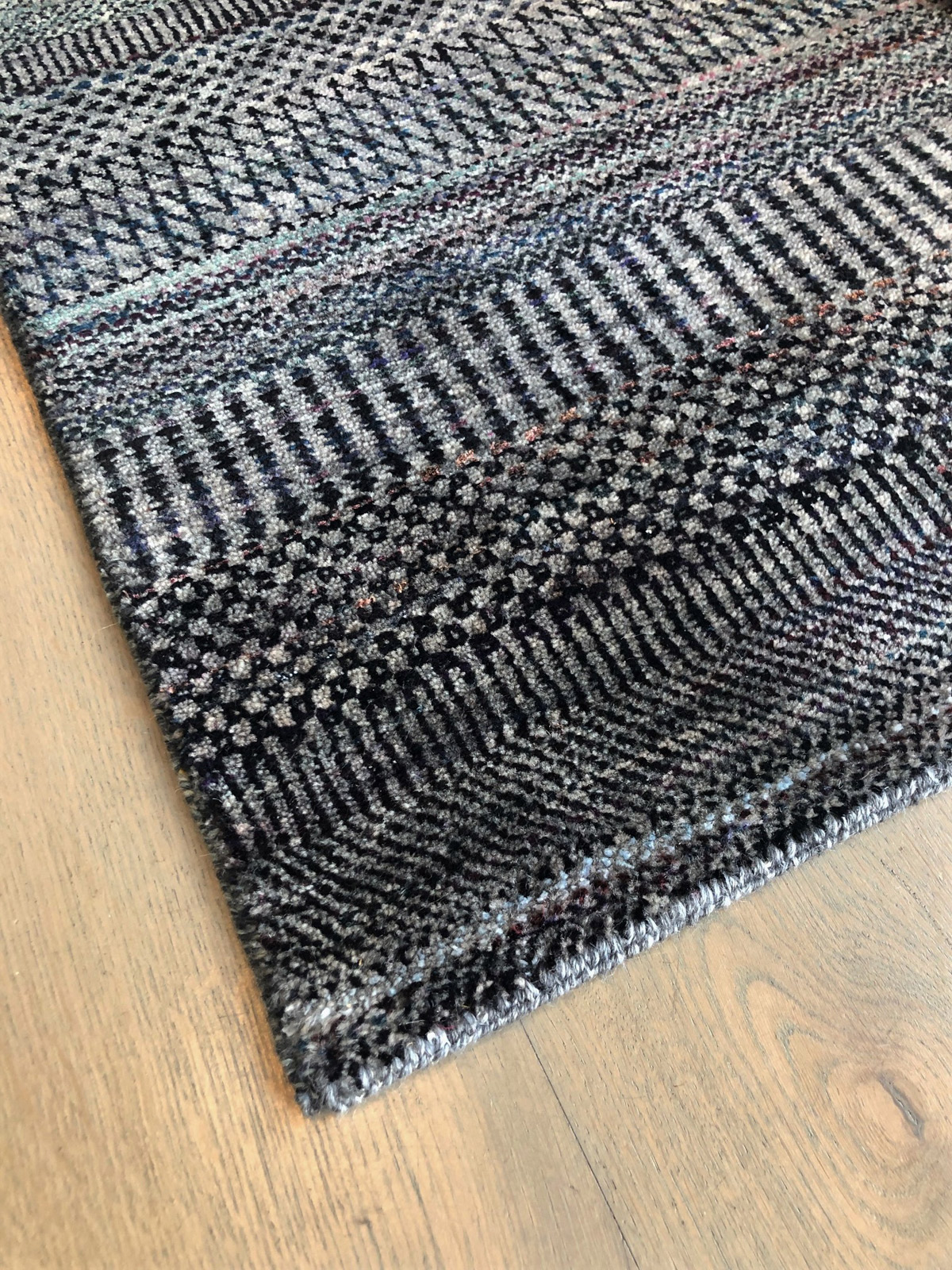 Samarkand Rug – Grey. This stunning hand knotted rug is created using gorgeously vibrant vintage saris, shredded and respun to form silk threads with endlessly evolving colour tones. Grey and black wool is lifted with threads of jewel colour and a subtle tribal design.