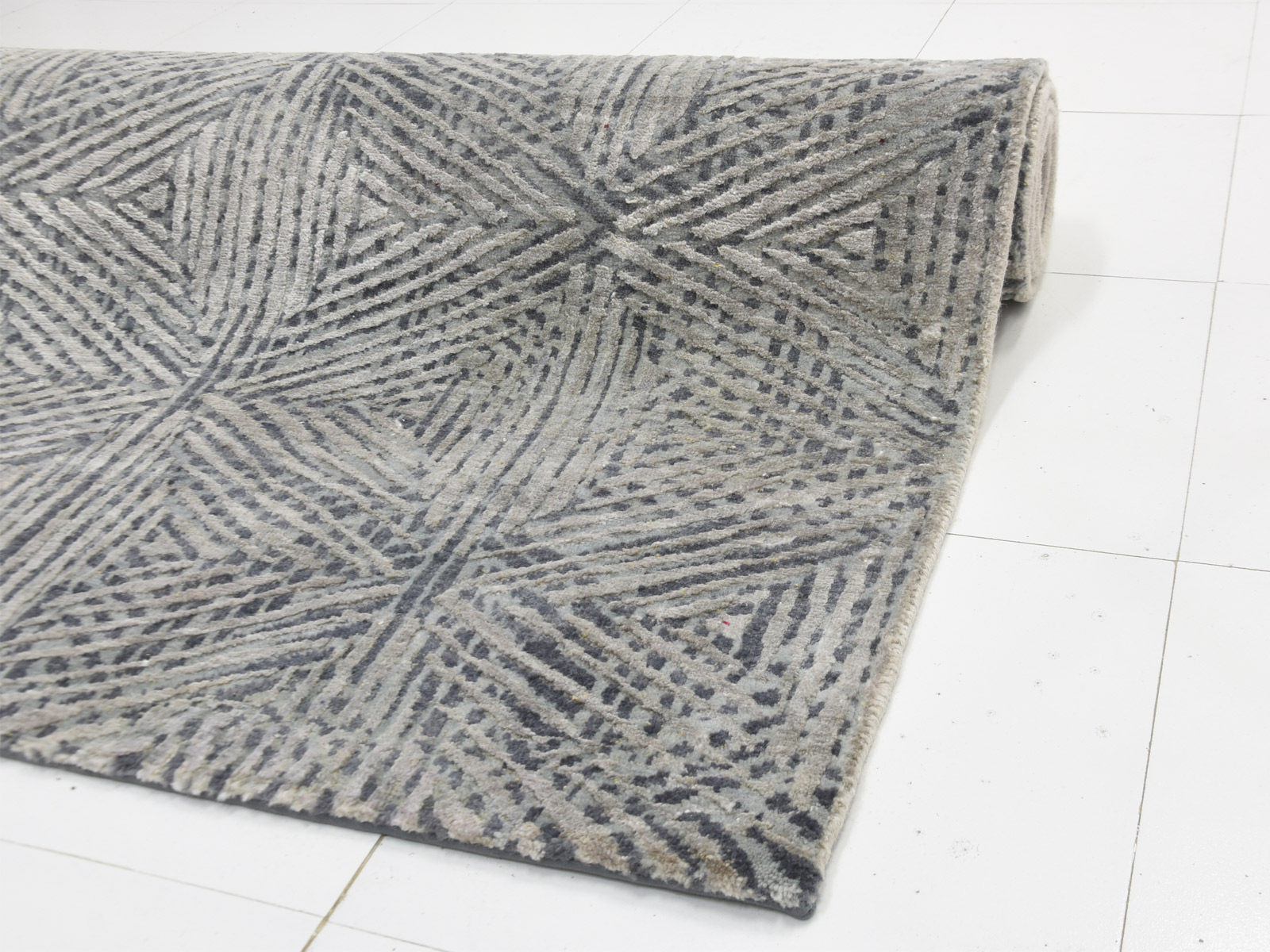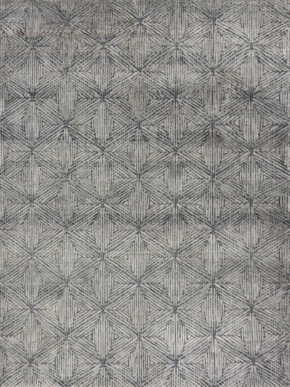 Starlight Rug 300x240cm. This beautiful textured rug is created from a silver coloured silk blend, hand carved to a high pile height. It’s repetitive geometric design is timeless and elegant, and created using the traditional method of hand knotting. This rug will adorn your floors for many years to come.