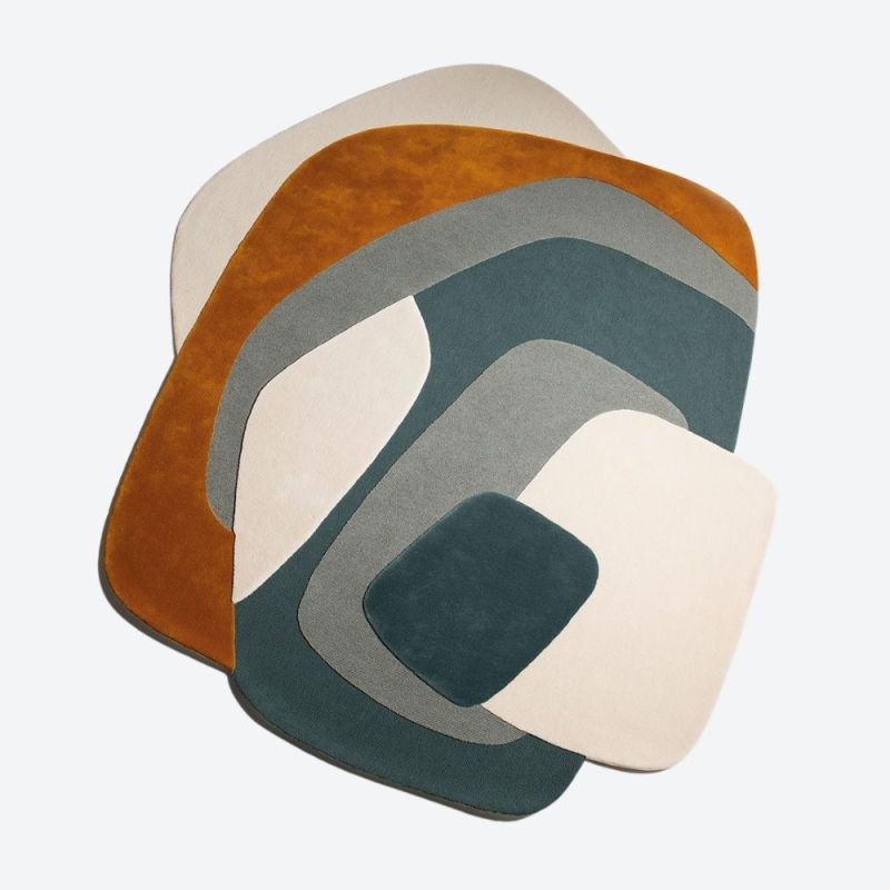 Tranquil Rug. Inspired by nature’s effortless geometry and the gentle layering of earth’s textures, “Tranquil” is a harmonious fusion of shape, colour, and flow. With its soft, irregular contours and overlapping tones of ochre, slate, cream, and forest green, this piece evokes the calm, grounding beauty of a topographic landscape.