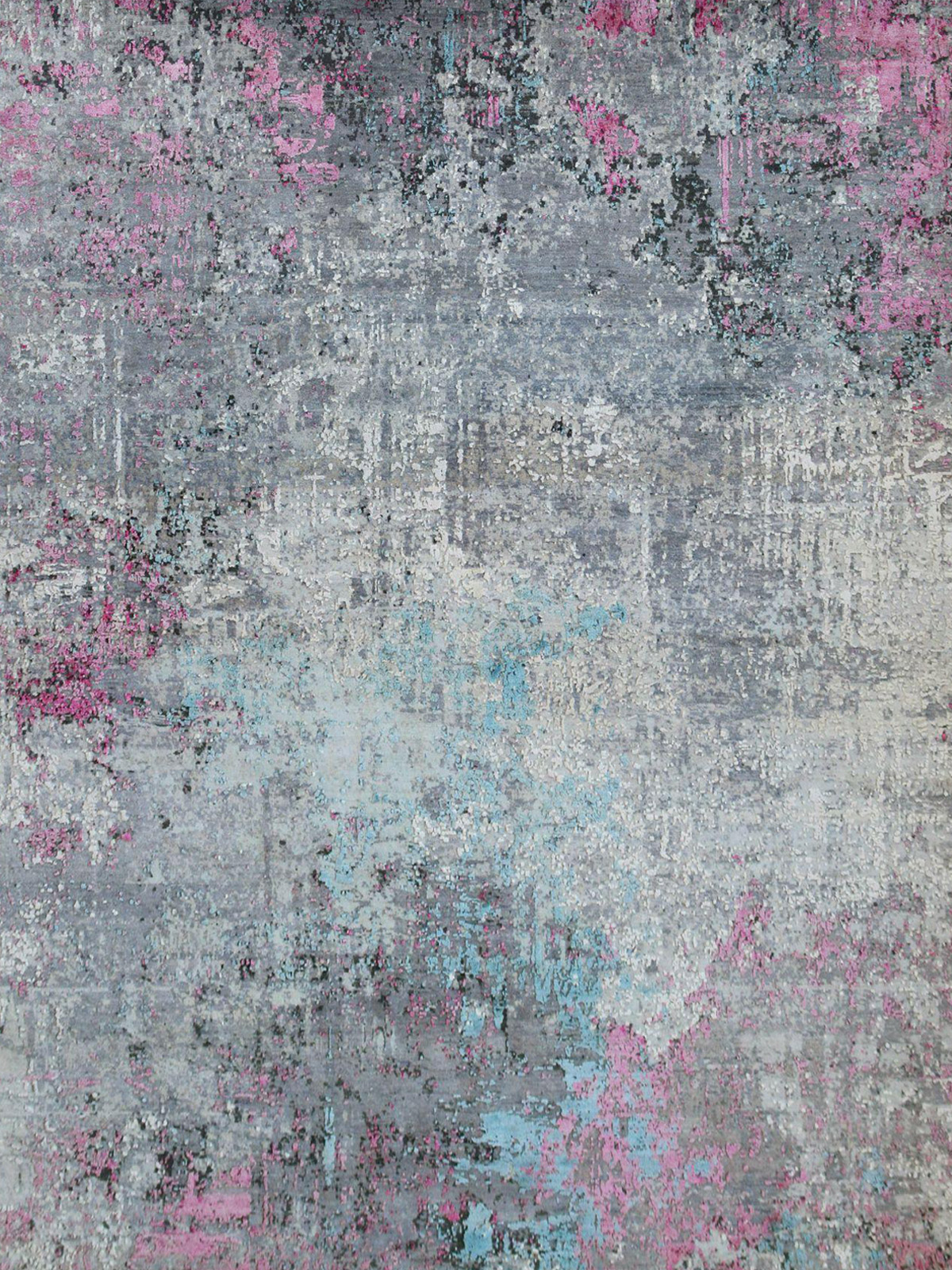 Twilight Mercury Rug – Multi. An abstract masterpiece in rug form, this dramatic luxury rug combines grey pink and blue tones for a truly memorable design. Each hand knotted rug is created individually by a team of skilled artisans, and this level of intricate colour variation requires the finest of weaves. For additional texture, this piece is hand carved to leave silk highlights at a raised pile height.