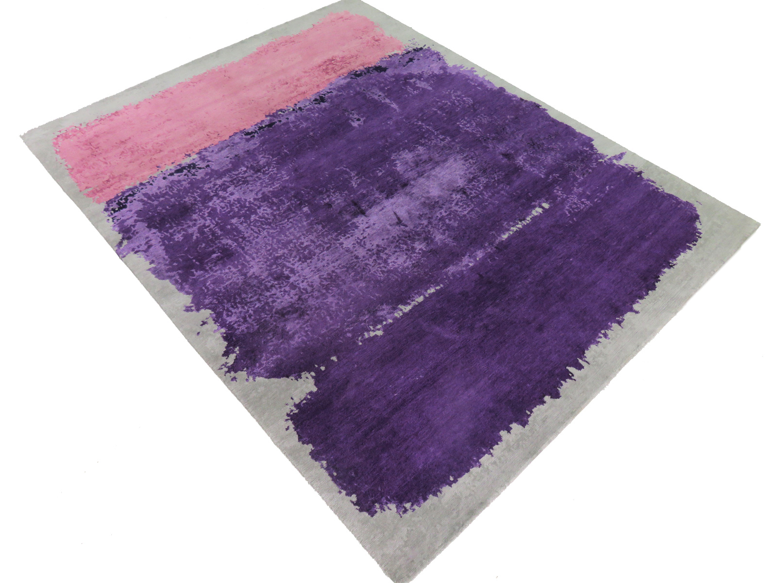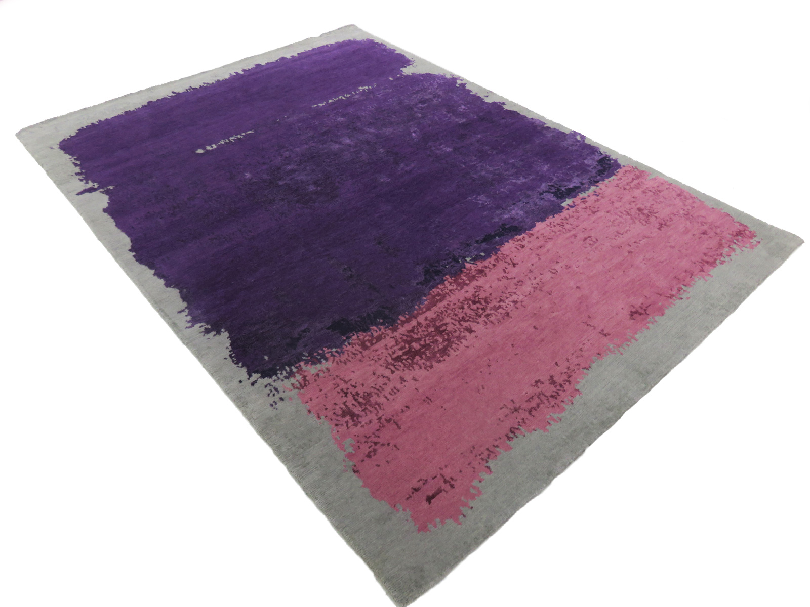 Untitled Rug – Parisian Purple. This purple colour-block rug is part of a new collection inspired by the modernist Colour Field. The outdoor landscape forms the basis of these multi-form paintings, giving them a natural rawness. Every region of colour is a perfect compliment to its surroundings, and is chosen to uplift and excite. Each ‘Untitled’ rug is created entirely by hand, adding richness and texture to the body of the design. The natural sheen of Himalayan Wool and Chinese Silk is the perfect match for intense dye colours. In keeping with ancient rug tradition, this exquisite material is hand carded, hand spun, then hand knotted to form a rug that can last a lifetime. Statement rug art at its finest.