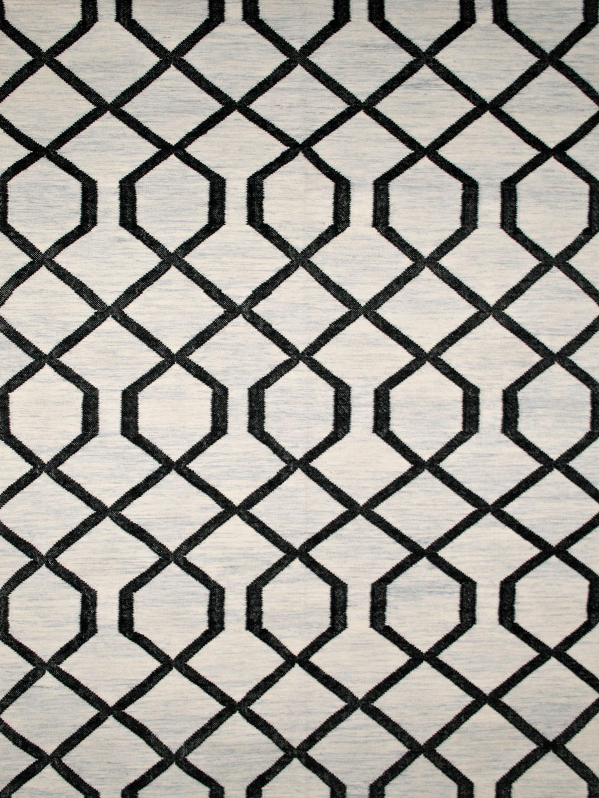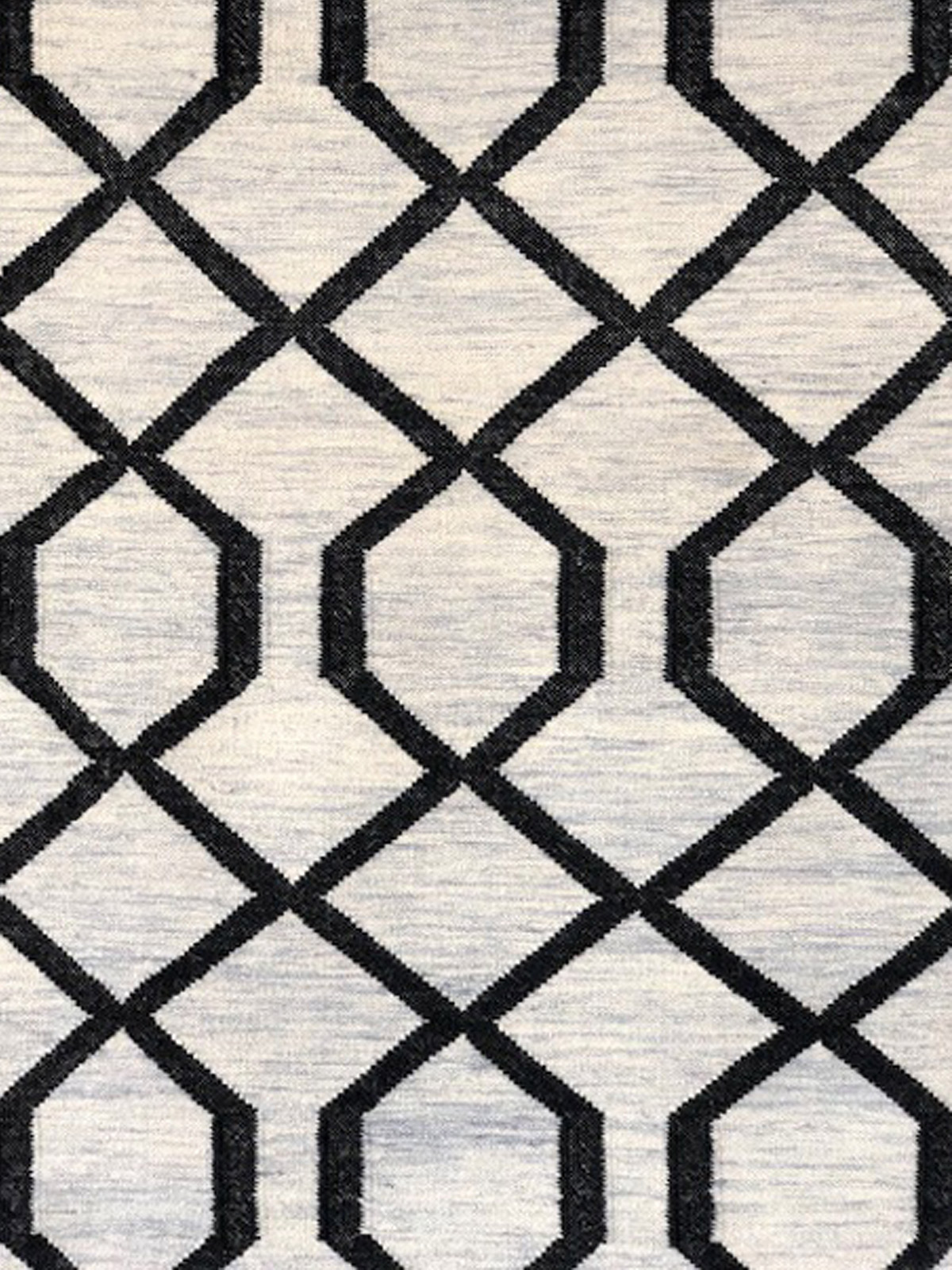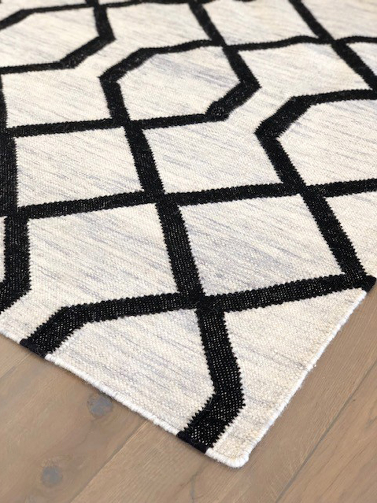 Ushak Rug – Liquorice. Deep black lines form a complex geometric design that can anchor any modern interior scheme. Each of our flatweave rugs, or ‘kelims’, are created entirely by traditional methods. A team of skilled artisans prepare and dye the wool by hand, then construct the rug from hand tied knots, giving every piece a characterful woven texture and varied colour tone. These rugs are cool and casual and are a perfect way to express your personal style in any room of the home.
