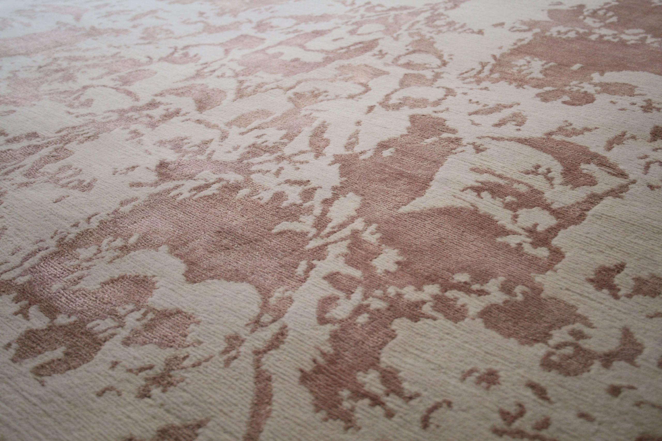 Viola Rug – Rose. In this innovative contemporary design, iconic British blooms are redefined in a luxurious pink silhouette. These are delicately arranged in a floral spray that echoes the beauty of an oriental masterpiece. Every piece is created by a team of skilled artisans who complete every stage of the process using traditional methods. From the preparation of the wool and silk, to constructing the rug knot by knot, this craftsmanship delivers a rug that will last generations.