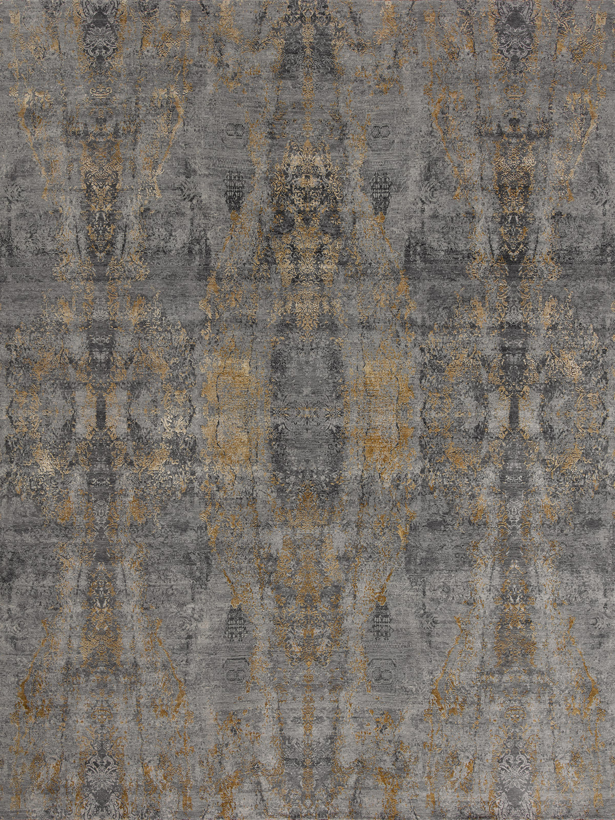 Visual Rug – Charcoal Gold. This astounding creation takes the elegance and beauty of the traditional hand knotted rug and lifts it to unprecedented levels of complexity and sophistication. The design is created with layers upon layers of different patterns, each created in blended flow of different gold and grey colour tones, intricately carved to varying heights. A lavish luxury rug.