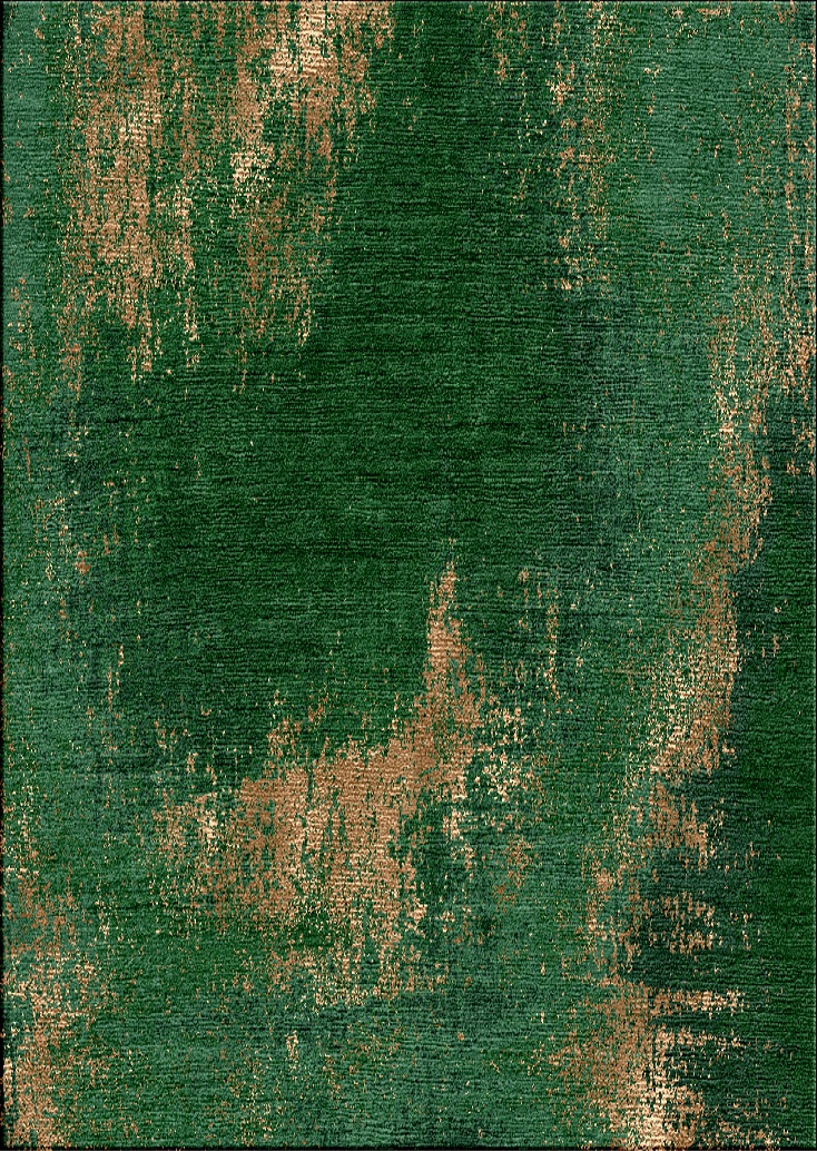 Washed Denim Rug – Emerald. Blended Emerald Green wools & copper coloured silks gives a luxurious highlight to a dramatic rug. Made entirely by hand using the traditional method of hand knotting, built to last generations.